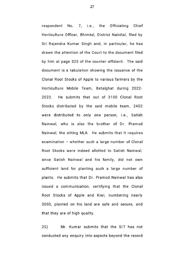 याचिकाकर्ता दीपक कगरेती के वकील ने विनय कुमार ने कोर्ट को बताया कि इस घोटाले में राज्य का राजनीतिक वर्ग भी शामिल है। विनय कुमार ने इसमें तत्कालीन कार्यवाहक मुख्य उद्यान अधिकारी, भीमताल राजेंद्र कुमार सिंह के जवाबी हलफनामे का हवाला दिया और जवाबी हलफनामे में दायर दस्तावेज पर अदालत का ध्यान आकर्षित किया. विनय कुमार ने कोर्ट को बताया कि उस दस्तावेज में 2022-2023 के दौरान हॉर्टिकल्चर मोबाइल टीम, बेतालघाट द्वारा विभिन्न किसानों को सेब के क्लोनल रूट स्टॉक जारी करने को दर्शाने वाली एक टेबल है. उनका कहना है कि मोबाइल टीम द्वारा वितरित 3100 क्लोनल रूट स्टॉक में से 2402 केवल एक ही व्यक्ति यानी सतीश नैनवाल को वितरित किए गए जो मौजूदा विधायक डॉ. प्रमोद नैनवाल के भाई भी हैं। विनय कुमार ने ये भी बताया कि इसके लिए जांच जरूरी है कि क्या इतनी बड़ी संख्या में क्लोनल रूट स्टॉक वास्तव में सतीश नैनवाल को आवंटित किए गए थे, क्योंकि इतनी बड़ी संख्या में पौधे लगाने के लिए सतीश नैनवाल और उनके परिवार के पास पर्याप्त जमीन नहीं थी. उनका कोर्ट को बताया कि डॉ. प्रमोद नैनवाल ने भी एक पत्र जारी किया है, जिसमें उन्होंने ये प्रमाणित किया है कि उनकी जमीन पर जो सेब और कीवी के क्लोनल रूट स्टॉक लगाए गए हैं वो सुरक्षित और संरक्षित हैं, साथ ही उच्च क्वालिटी वाले हैं।