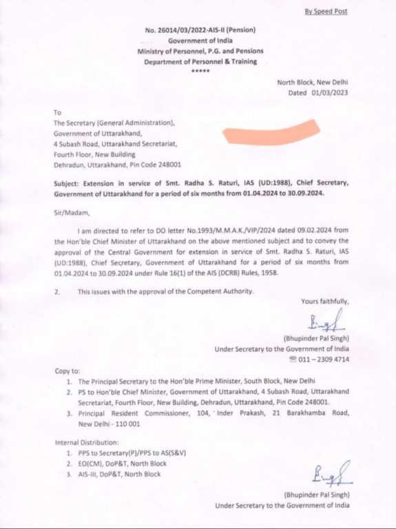 IAS राधा रतूड़ी को 6 महीने का सेवा विस्तार मिल गया है। अब अगले 6 महीने तक वो उत्तराखंड की मुख्य सचिव बनीं रहेंगी। उनका कार्यकाल इसी महीने के आखिर में खत्म हो रहा था मगर राज्य सरकार की सिफारिश पर केंद्र सरकार ने 6 महीने के सेवा विस्तार को मंजूरी दे दी। राधा रतूड़ी का कार्यकाल अब 30 सितंबर को खत्म होगा। केंद्र ने 1 मार्च को ही राधा रतूड़ी के सेवा विस्तार का आदेश जारी किया है।