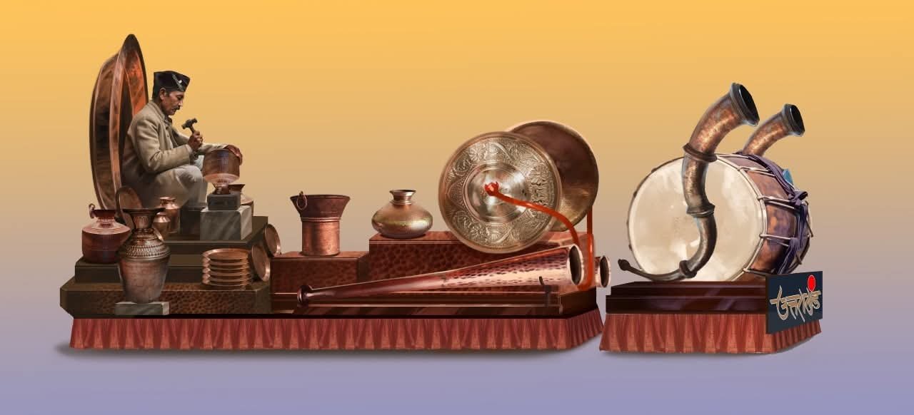 सूचना विभाग के संयुक्त निदेशक एवं झांकी के नोडल अधिकारी श्री के.एस. चौहान ने बताया कि “आत्मनिर्भर उत्तराखण्ड” झांकी के ट्रैक्टर सेक्शन में पारंपरिक वाद्य यंत्रों ढोल और रणसिंघा की आकर्षक तांबे की प्रतिकृतियां हैं, जो उत्तराखण्ड की समृद्ध सांस्कृतिक विरासत और शिल्पी कारीगरों की कलात्मक महारत का प्रतीक हैं। ट्रेलर सेक्शन के पहले भाग में तांबे के मंजीरे की एक बड़ी मूर्ति दिखायी गई है, जो तांबे की कला की बारीकियों को विस्तार से उजागर करती है। बीच का सेक्शन खूबसूरती से बनाए गए तांबे के बर्तन जैसे गागर, सुरही, कुण्डी को दर्शाया गया है, जो उत्तराखण्ड के पारंपरिक घरेलू जीवन के आवश्यक तत्व हैं। इस सेक्शन के नीचे, साइड पैनल पारंपरिक वाद्ययंत्र भोंकोर के प्रमुख चित्रणों से सजाए गए हैं, जो सांस्कृतिक कहानी को और समृद्ध करते हैं। झांकी के पिछले सेक्शन में तांबे के कारीगर की एक आकर्षक और प्रभावशाली मूर्ति है, जो हाथ से तांबे के बर्तन बनाने की प्रक्रिया में लगा हुआ है। कारीगर के चारों ओर बारीकी से बनाए गए तांबे के बर्तन हैं, जो पीढ़ियों से मिले ज्ञान, कौशल और श्रम की गरिमा का प्रतीक हैं।