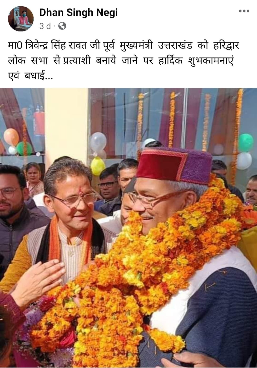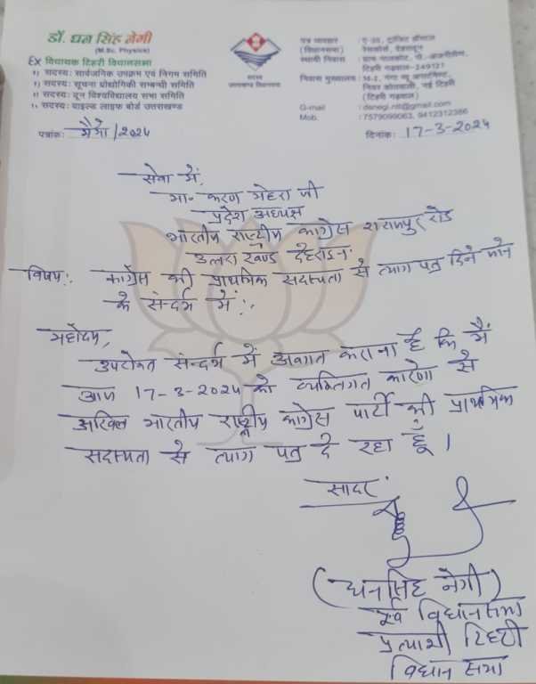 टिहरी लोकसभा में कांग्रेस को लगातार झटके लग रहे हैं। पूर्व विधायक और 2022 में कांग्रेस के टिकट पर टिहरी विधानसभा सीट से चुनाव लड़े धन सिंह नेगी ने कांग्रेस छोड़ दी है। धन सिंह नेगी ने कांग्रेस प्रदेश अध्यक्ष करन माहरा को अपना इस्तीफा भेजा है। नेगी जल्द ही बीजेपी में वापसी करेंगे। 2022 में टिकट कटने की वजह से धन सिंह नेगी ने कांग्रेस ज्वाइन कर ली थी। मगर 2 साल बाद ही वो फिर से बीजेपी में वापसी कर रहे हैं। धन सिंह नेगी ने कहा है कि वो लोकसभा चुनाव में बीजेपी उम्मीदवारों को जिताने के लिए काम करेंगे। 2022 में बीजेपी ने कांग्रेस के पूर्व प्रदेश अध्यक्ष किशोर उपाध्याय को टिहरी से चुनाव लड़ाया था और वो जीत गए थे। पार्टी के इस फैसले के बाद ही तत्कालीन सिटिंग विधायक धन सिंह नेगी ने बीजेपी छोड़ने का फैसला किया था।