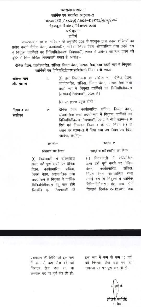 सचिव कार्मिक, श्री शैलेश बगौली द्वारा इस संबंध में आज अधिसूचना निर्गत की गई। संशोधित नियमावली के अनुसार, अन्य शर्तें पूर्ण करने पर दैनिक वेतन, कार्यप्रभारित, संविदा, नियत वेतन, अंशकालिक तथा तदर्थ रूप से नियुक्त वे कार्मिक विनियमितीकरण हेतु पात्र होंगे, जिन्होंने 04 दिसंबर 2018 तक इस रूप में कम से कम 10 वर्ष की निरन्तर सेवा उस पद या समकक्ष पद पर पूर्ण कर ली हो।