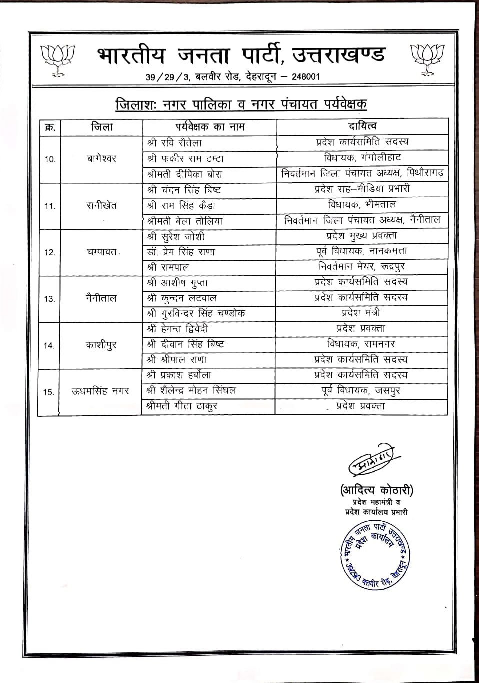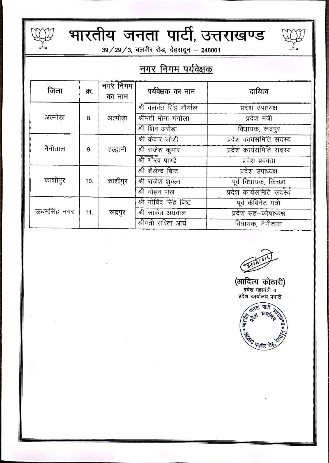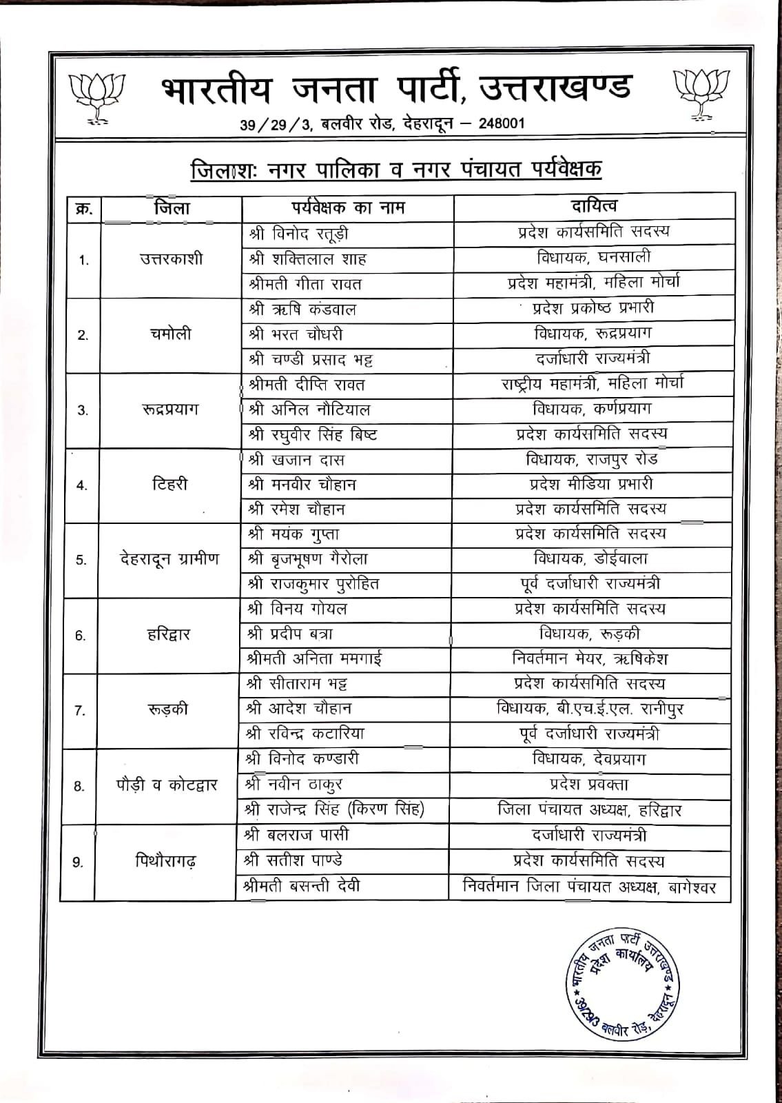उत्तराखंड बीजेपी ने निकाय चुनाव के लिए चुनाव के लिए पर्यवेक्षक नियुक्त कर दिये हैं। पार्टी की ओर से इसकी सूची जारी कर दी गयी है। सभी नगर निगम, नगर पालिका और नगर पंचायतों के लिए अलग अलग नेताओं को जिम्मेदारी सौंपी गई है।