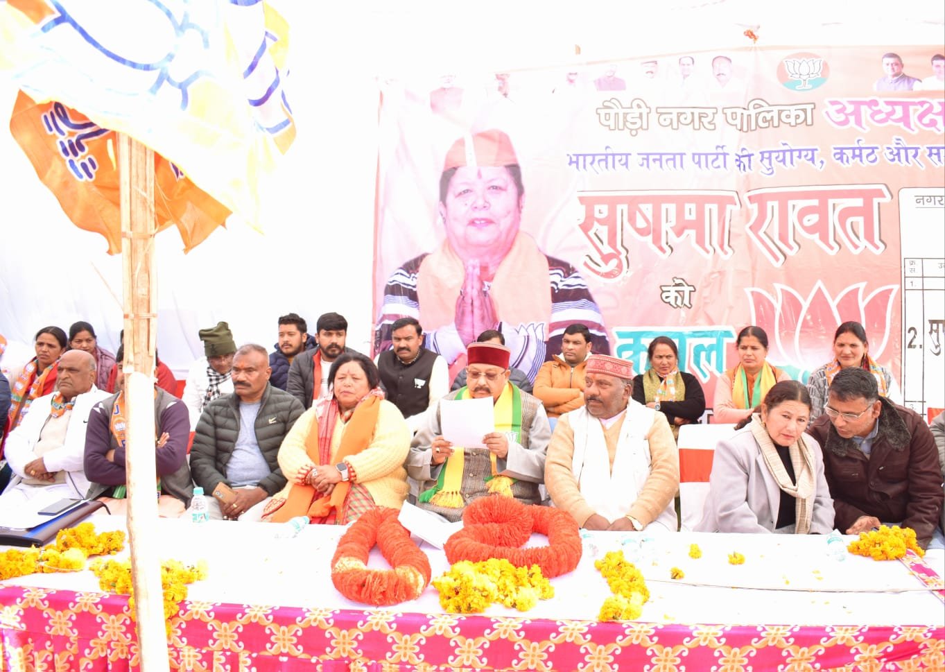 पौड़ी नगर पालिका अध्यक्ष पद की भाजपा प्रत्याशी सुषमा रावत और पार्टी सभी वार्ड प्रत्याशियों के सर्मथन में बस स्टैंड पर आयोजित चुनावी सभा को सम्बोधित करते हुए महाराज ने कहा कि स्थानीय स्तर पर विकास के लिए जरूरी है कि निकाय चुनावों में भारतीय जनता पार्टी की जीत का पररचम लहराये और ट्रिपल इंजन की सरकार बने।