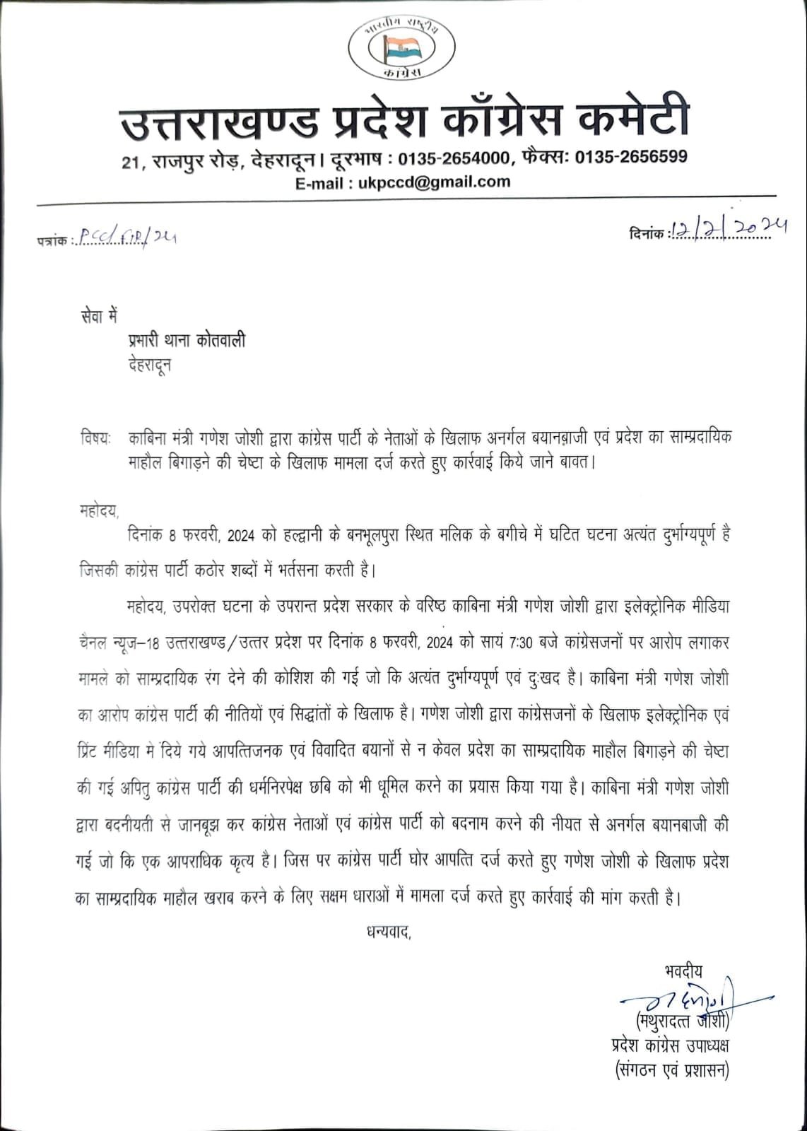 कैबिनेट गणेश जोशी के खिलाफ कांग्रेस ने मुकदमा दर्ज करने की मांग की है। कांग्रेस ने देहरादून पुलिस को तहरीर दी है और मंत्री पर साम्प्रदायिक माहौल बिगाड़ने की धाराओं में केस दर्ज करने की गुजारिश की है।