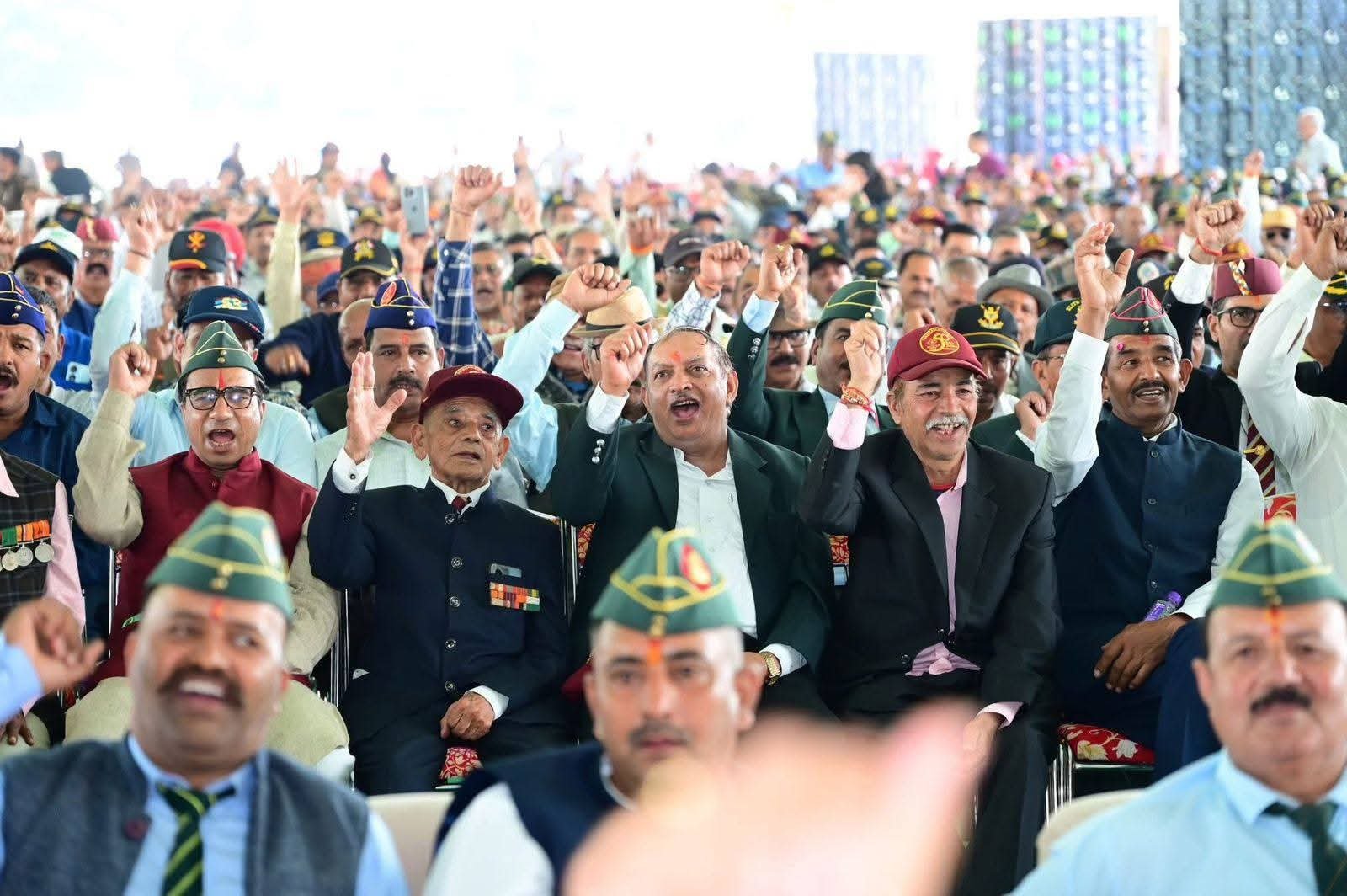 मुख्यमंत्री ने उपस्थित पूर्व सैनिकों पर पुष्पवर्षा कर राज्य निर्माण व राष्ट्र सेवा में उनके योगदान के लिये अभिनन्दन किया। उन्होंने कहा कि उत्तराखण्ड का हर परिवार गर्व से कह सकता है कि उसके घर से कोई न कोई भारत माता की सेवा में समर्पित है। मुख्यमंत्री ने कहा कि देवभूमि उत्तराखण्ड वास्तव में वीरभूमि है, जहाँ की माटी में ही राष्ट्रभक्ति और बलिदान की भावना रची-बसी है।