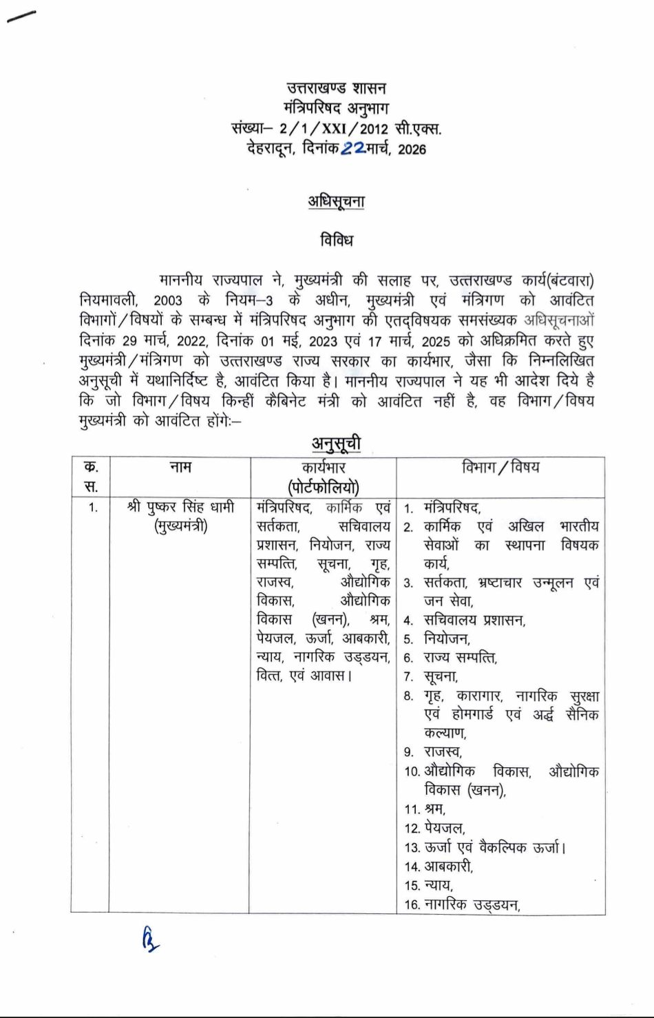 उत्तराखंड में मंत्रिमंडल विस्तार के बाद विभागों का व्यापक बंटवारा करते हुए सरकार ने प्रशासनिक संतुलन साधने की कोशिश की है। इस फेरबदल में न केवल नए मंत्रियों को जिम्मेदारियां सौंपी गई हैं, बल्कि कई महत्वपूर्ण विभाग पुराने मंत्रियों से लेकर नए चेहरों को दिए गए हैं।