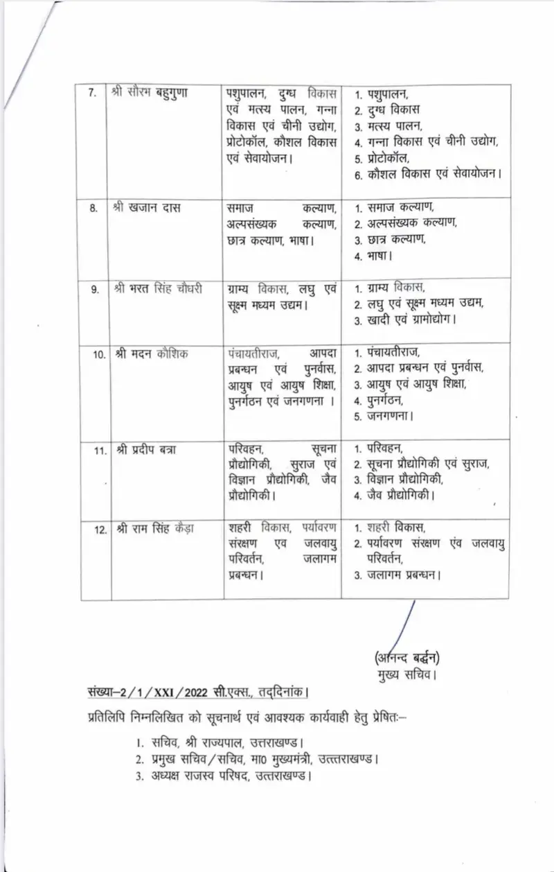नए आवंटन के तहत राम सिंह कैड़ा को शहरी विकास, पर्यावरण और जलागम प्रबंधन, मदन कौशिक को पंचायतीराज और आपदा प्रबंधन, प्रदीप बत्रा को परिवहन और सूचना प्रौद्योगिकी, खजान दास को समाज कल्याण व भाषा, जबकि भरत सिंह चौधरी को ग्राम्य विकास और एमएसएमई जैसे अहम विभाग सौंपे गए हैं।
