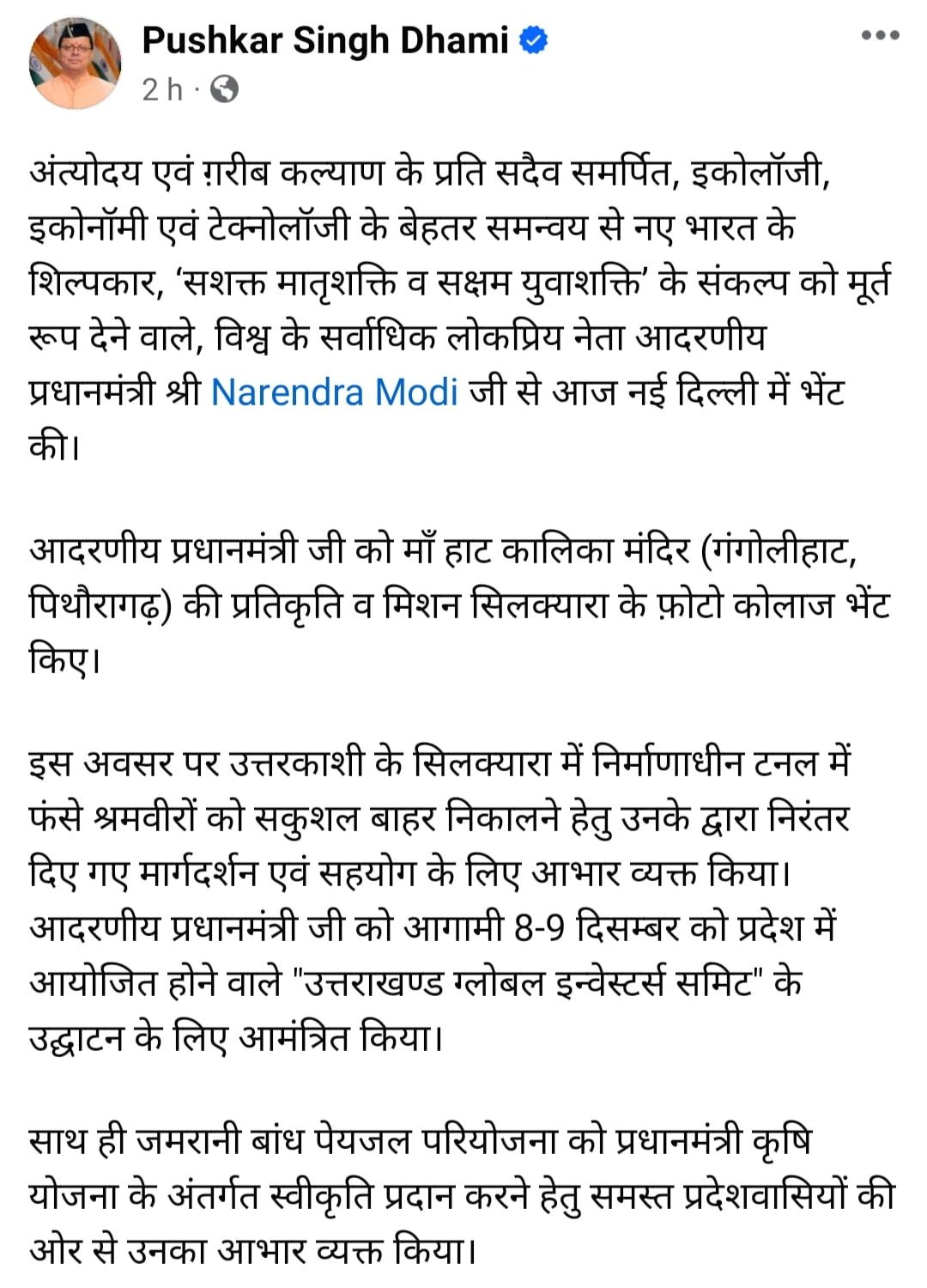पीएम से मुलाकात के बाद सीएम धामी ने सोशल मीडिया पर पोस्ट की जिसमें उन्होंने लिखा “अंत्योदय एवं ग़रीब कल्याण के प्रति सदैव समर्पित, इकोलॉजी, इकोनॉमी एवं टेक्नोलॉजी के बेहतर समन्वय से नए भारत के शिल्पकार, ‘सशक्त मातृशक्ति व सक्षम युवाशक्ति’ के संकल्प को मूर्त रूप देने वाले, विश्व के सर्वाधिक लोकप्रिय नेता आदरणीय प्रधानमंत्री Narendra Modi जी से आज नई दिल्ली में भेंट की। प्रधानमंत्री को माँ हाट कालिका मंदिर (गंगोलीहाट, पिथौरागढ़) की प्रतिकृति व मिशन सिलक्यारा के फ़ोटो कोलाज भेंट किए। इस अवसर पर उत्तरकाशी के सिलक्यारा में निर्माणाधीन टनल में फंसे श्रमवीरों को सकुशल बाहर निकालने हेतु उनके द्वारा निरंतर दिए गए मार्गदर्शन एवं सहयोग के लिए आभार व्यक्त किया। आदरणीय प्रधानमंत्री जी को आगामी 8-9 दिसम्बर को प्रदेश में आयोजित होने वाले “उत्तराखण्ड ग्लोबल इन्वेस्टर्स समिट” के उद्घाटन के लिए आमंत्रित किया। साथ ही जमरानी बांध पेयजल परियोजना को प्रधानमंत्री कृषि योजना के अंतर्गत स्वीकृति प्रदान करने हेतु समस्त प्रदेशवासियों की ओर से उनका आभार व्यक्त किया। इस दौरान आदरणीय प्रधानमंत्री से सौंग बांध पेयजल परियोजना को पूंजीगत व्यय हेतु वित्तीय सहायता प्रदान करने, हरिद्वार में अखिल भारतीय आयुर्वेद संस्थान की स्थापना, जौलीग्रांट हवाई अड्डे के उच्चीकरण हेतु विशेष वित्तीय सहायता, Kiwi Feasibility Study में उत्तराखण्ड को सम्मिलित करने के लिए अनुरोध किया।