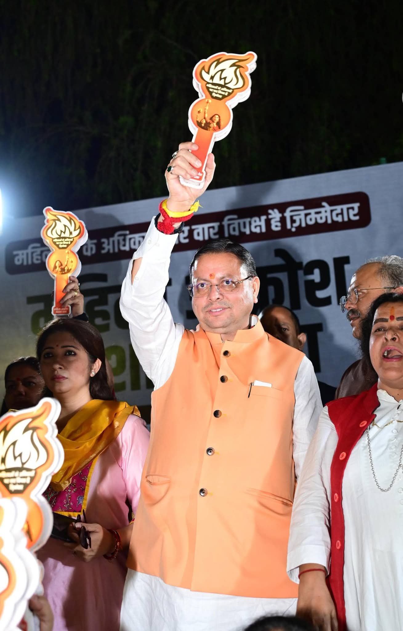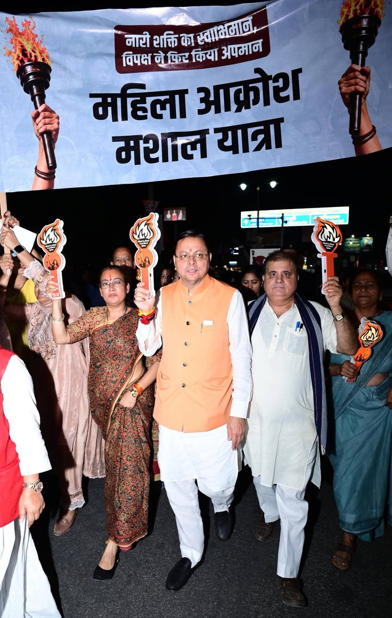 देहरादून के गांधी पार्क से घंटाघर तक आयोजित महिला आक्रोश मशाल यात्रा में आज प्रदेश भर से आई महिलाओं ने भारी संख्या में सहभागिता कर अपने अधिकारों के प्रति जागरूकता और आक्रोश का सशक्त प्रदर्शन किया। इस अवसर पर उत्तराखंड के मुख्यमंत्री पुष्कर सिंह धामी ने यात्रा को संबोधित करते हुए कांग्रेस पर तीखा प्रहार किया।