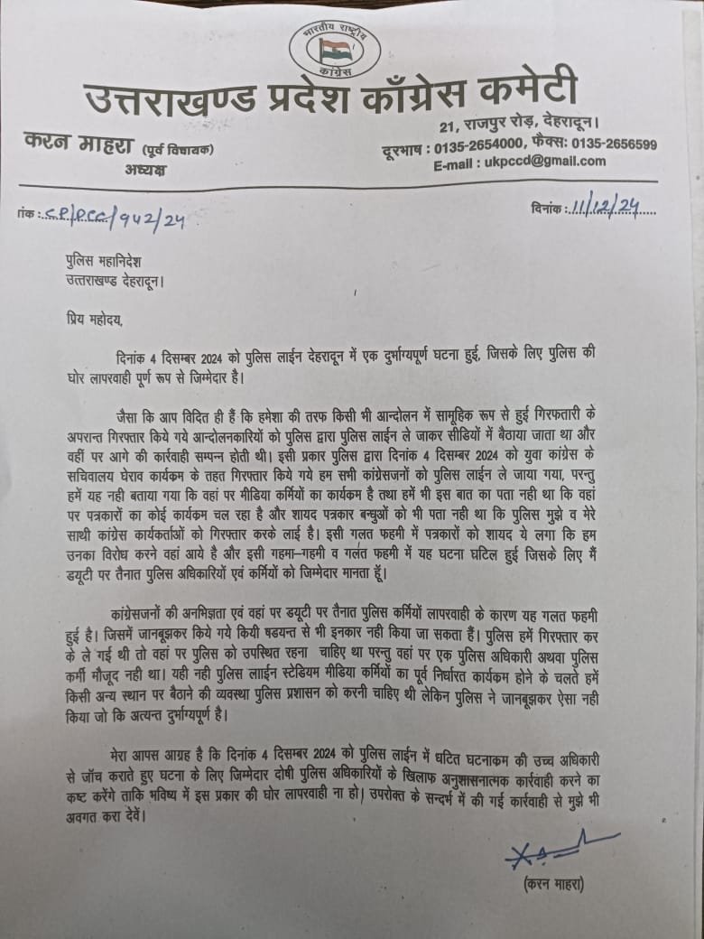 ज्ञापन देते हुए जोशी ने पुलिस प्रशासन पर आरोप लगाते हुए कहा कि हमेषा की तरफ किसी भी आन्दोलन में सामूहिक रूप से हुई गिरफ्तारी के अपरान्त गिरफ्तार किये गये आन्दोलनकारियों को पुलिस द्वारा पुलिस लाईन ले जाकर सीडियों में बैठाया जाता था और वहीं पर आगे की कार्रवाही सम्पन्न होती थी। इसी प्रकार पुलिस द्वारा दिनांक 4 दिसम्बर 2024 को युवा कांग्र्रेस के सचिवालय घेराव कार्यक्रम के तहत गिरफ्तार किये गये हम सभी कांग्रेसजनों को पुलिस लाईन ले जाया गया, परन्तु हमें यह नही बताया गया कि वहां पर मीडिया कर्मियों का कार्यक्रम है तथा हमें भी इस बात का पता नही था कि वहां पर पत्रकारों का कोई कार्यक्रम चल रहा है और शायद पत्रकार बन्धुओं को भी पता नहीं था कि पुलिस मुझे और मेरे साथी कांग्रेस कार्यकर्ताओं को गिरफ्तार करके लाई है। इसी गलत फहमी में पत्रकारों को शायद ये लगा कि हम उनका विरोध करने वहां आये है और इसी गहमा-गहमी व गलत फहमी में यह घटना घटिल हुई जिसके लिए मैं डयूटी पर तैनात पुलिस अधिकारियों एवं कर्मियों को जिम्मेदार मानता हूूॅ।