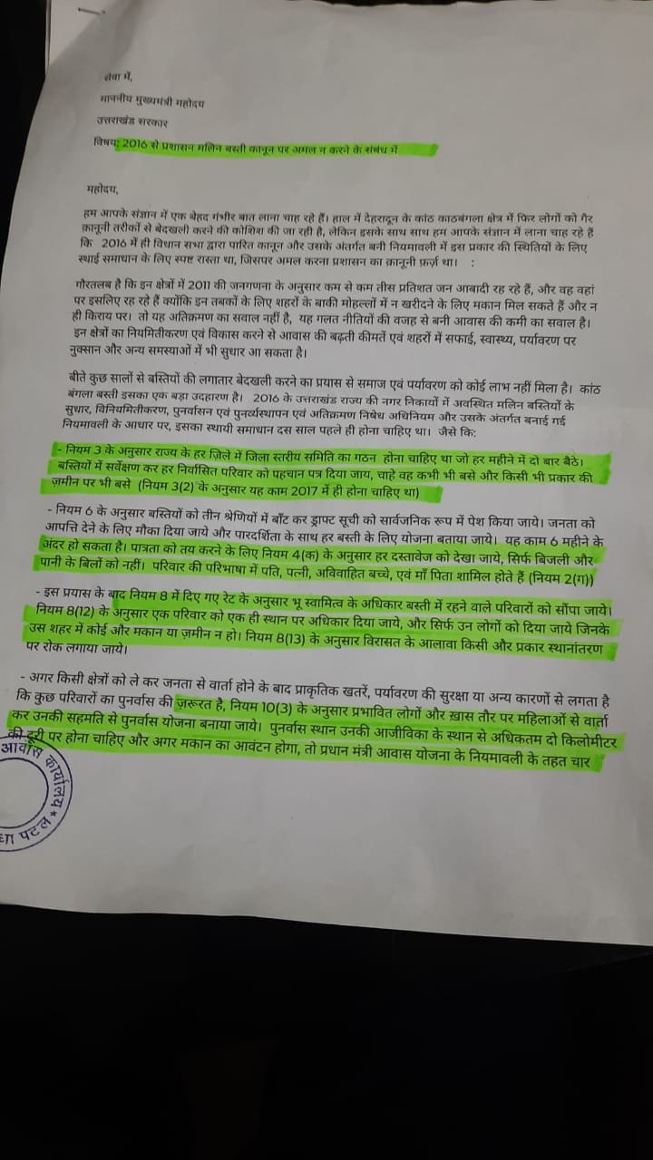उत्तराखंड की मलिन बस्तियों को लेकर 2016 और 2018 में विधानसभा द्वारा पारित एक्ट के अनुसार अधिकारियों द्वारा कार्य न किए जाने और गैर संवैधानिक और उत्तराखंड सरकार के 2016 एवं 2018 के एक्ट के विरुद्ध जाकर उत्तराखंड में और विशेष तौर से देहरादून में बस्तियों को निरंकुश तरीके से उजाड़ने के विरोध में प्रदर्शन कर मुख्यमंत्री आवास जाकर कांग्रेस प्रतिनिधिमंडल ने मुख्यमंत्री को प्रेषित ज्ञापन उनके कार्यालय में सौंपा । इस ज्ञापन में उत्तराखंड सरकार के एक्ट की विभिन्न धाराओं नियमों एवं उप नियमों का उल्लेख करते हुए यह मांग की की जो कानून विधानसभा में खुद सरकार ने पास किया है और वर्तमान में प्रचलन में है उसे पर अमल करते हुए ही बस्तियों को पुनर्वासित करने एवं उनका शिफ्ट करने का कार्य किया जाए।