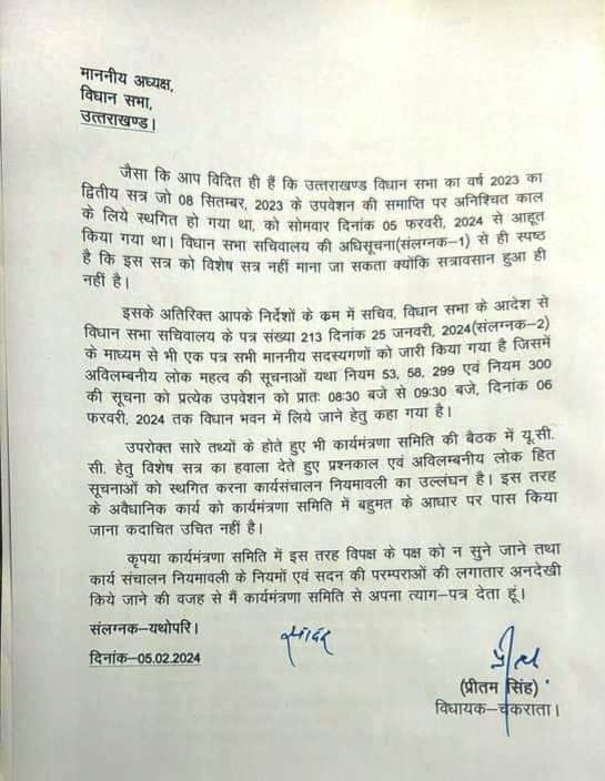 ● सभी माननीय सदस्यगणों को जारी विधानसभा सचिवालय के पत्र संख्या 213 दिनांक 25 जनवरी, 2024 (संलग्नक-2) के द्वारा अविलम्बनीय लोक महत्व की सूचनाओं यथा नियम 53, 58, 299 एवं नियम 300 की सूचना को प्रत्येक उपवेशन को प्रातः 8:30 से 9:00 बजे तक लिए जाने हेतु कहा गया है। उपरोक्त सारे तथ्यों के होते हुए भी कार्यमंत्रणा समिति की बैठक में यू.सी.सी हेतु विशेष सत्र का हवाला देते हुए प्रश्नकाल व अविलम्बनीय लोकहित की सूचनाओं को स्थगित करना कार्यसंचालन नियमावली का उल्लंघन है तथा इस तरह के अवैधानिक कार्य को कार्यमंत्रणा समिति में बहुमत के आधार पर पास किया जाना कदापि उचित नहीं।