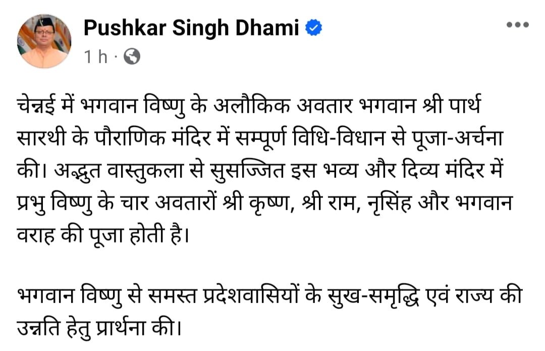दर्शन के बाद मुख्यमंत्री धामी ने कहा चेन्नई में भगवान विष्णु के अलौकिक अवतार भगवान श्री पार्थ सारथी के पौराणिक मंदिर में सम्पूर्ण विधि-विधान से पूजा-अर्चना की। अद्भुत वास्तुकला से सुसज्जित इस भव्य और दिव्य मंदिर में प्रभु विष्णु के चार अवतारों श्री कृष्ण, श्री राम, नृसिंह और भगवान वराह की पूजा होती है।