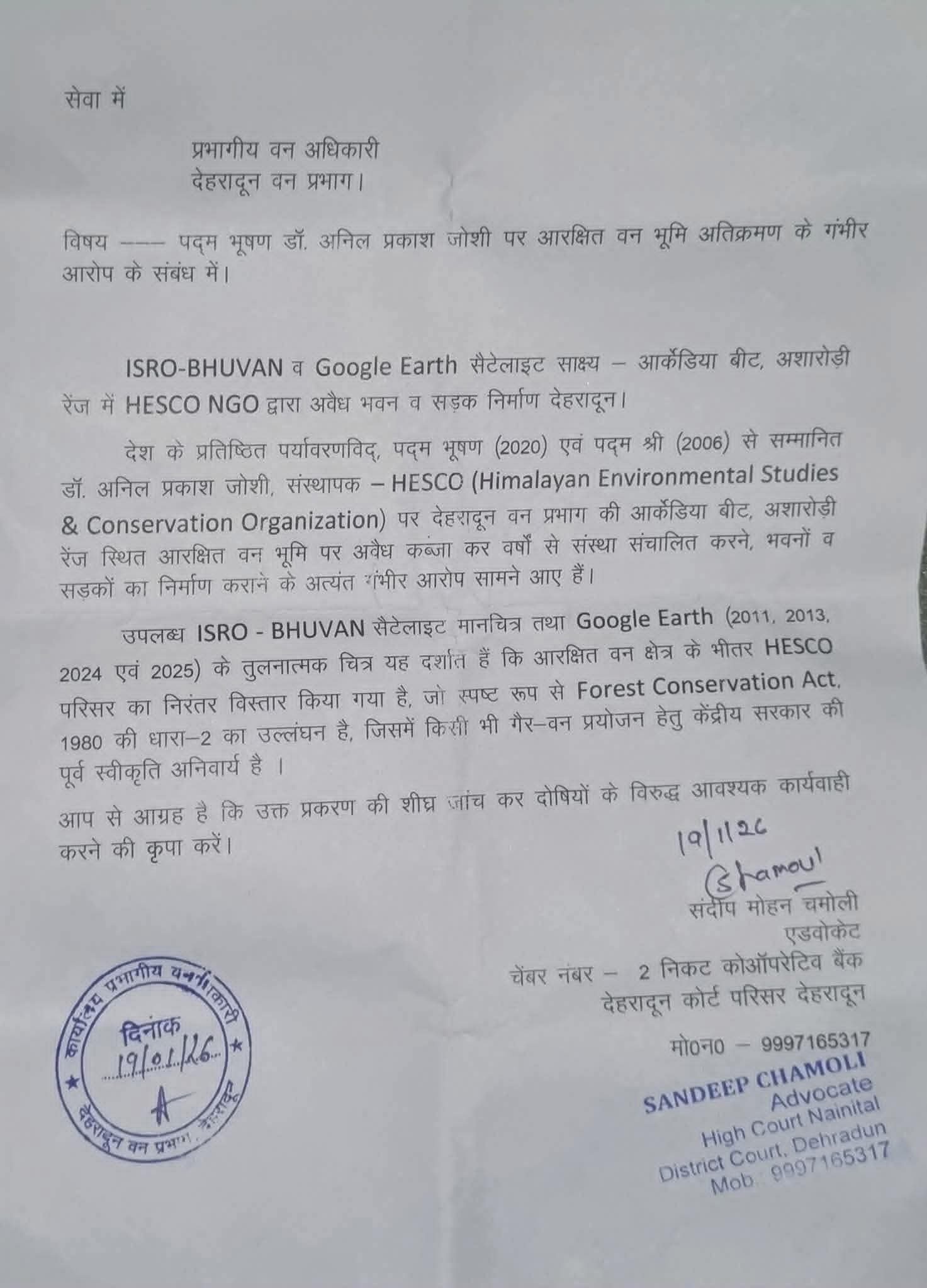 उपलब्ध ISRO-BHUVAN सैटेलाइट मानचित्र तथा Google Earth (2011, 2013, 2024 एवं 2025) के तुलनात्मक चित्र यह दर्शाते हैं कि आरक्षित वन क्षेत्र के भीतर HESCO परिसर का निरंतर विस्तार किया गया है, जो स्पष्ट रूप से Forest Conservation Act, 1980 की धारा-2 का उल्लंघन है, जिसमें किसी भी गैर-वन प्रयोजन हेतु केंद्रीय सरकार की पूर्व स्वीकृति अनिवार्य है । आप से आग्रह है कि उक्त प्रकरण की शीघ्र जांच कर दोषियों के विरुद्ध आवश्यक कार्यवाही करने की कृपा करें।