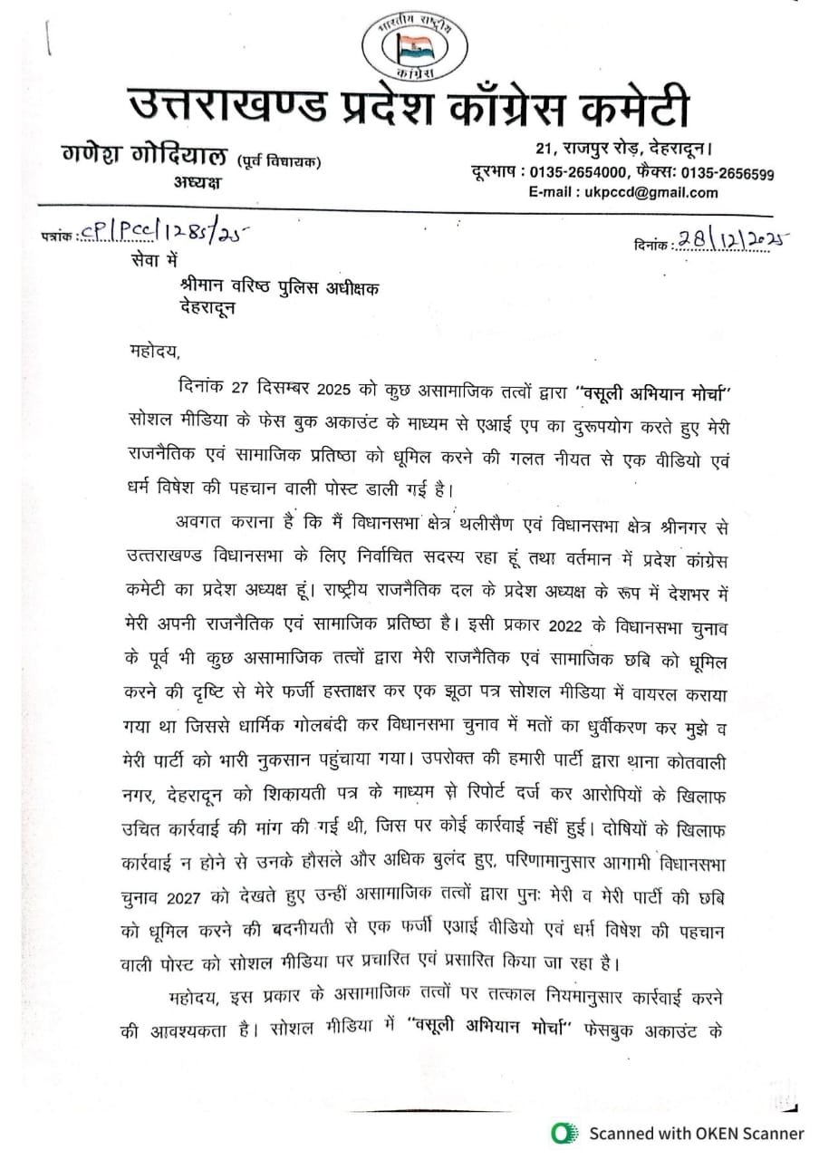 वरिष्ठ पुलिस अधीक्षक के नाम संबोधित शिकायती पत्र में प्रदेश कांग्रेस अध्यक्ष श्री गणेश गोदियाल ने कहा कि दिनांक 27 दिसम्बर 2025 को कुछ असामाजिक तत्वों द्वारा ‘‘वसूली अभियान मोर्चा’’ सोशल मीडिया के फेस बुक अकाउंट के माध्यम से एआई एप का दुरूपयोग करते हुए मेरी राजनैतिक एवं सामाजिक प्रतिष्ठा को धूमिल करने की गलत नीयत से एक वीडियो एवं धर्म विषेश की पहचान वाली पोस्ट डाली गई है।