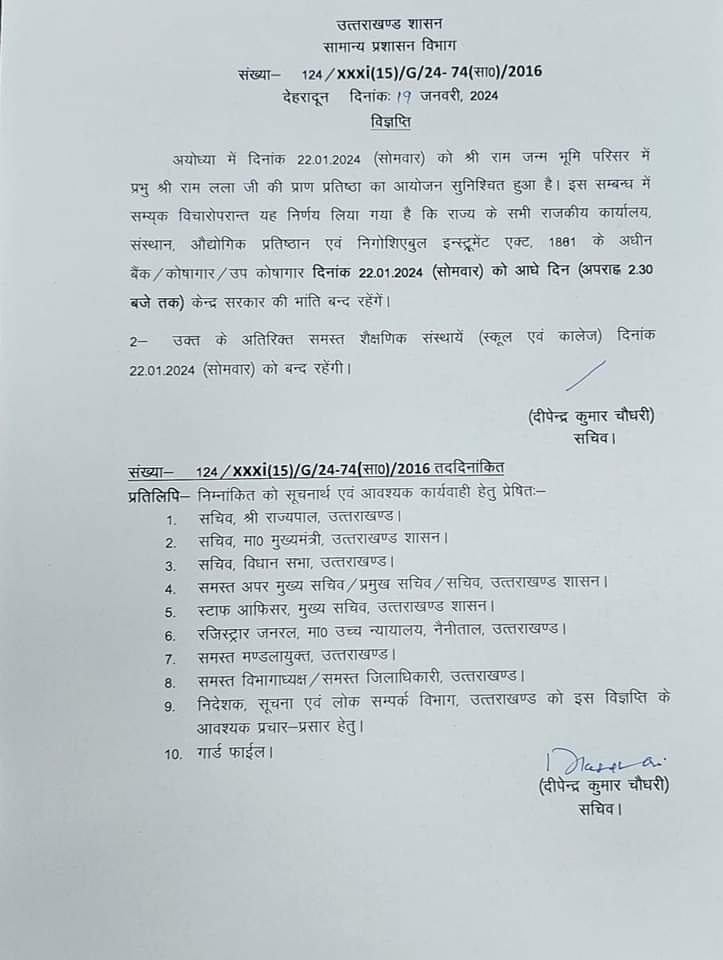 केंद्र सरकार की तरह ही उत्तराखंड में भी 22 जनवरी को सरकारी दफ्तरों में आधे दिन की छुट्टी रहेगी। इसका आदेश भी जारी कर दिया गया है। धामी सरकार ने साफ किया है कि अयोध्या में दिनांक 22.01.2024 को श्री राम जन्म भूमि में श्री राम लला की प्राण प्रतिष्ठा के दृष्टिगत राज्य के सभी राजकीय कार्यालय, संस्थान, औद्योगिक प्रतिष्ठान एवं बैंक /कोषागार /उप कोषागार दिनांक 22 जनवरी को आधे दिन (अपराह्न 2.30 बजे तक) केन्द्र सरकार की भांति बन्द रहेंगे।
