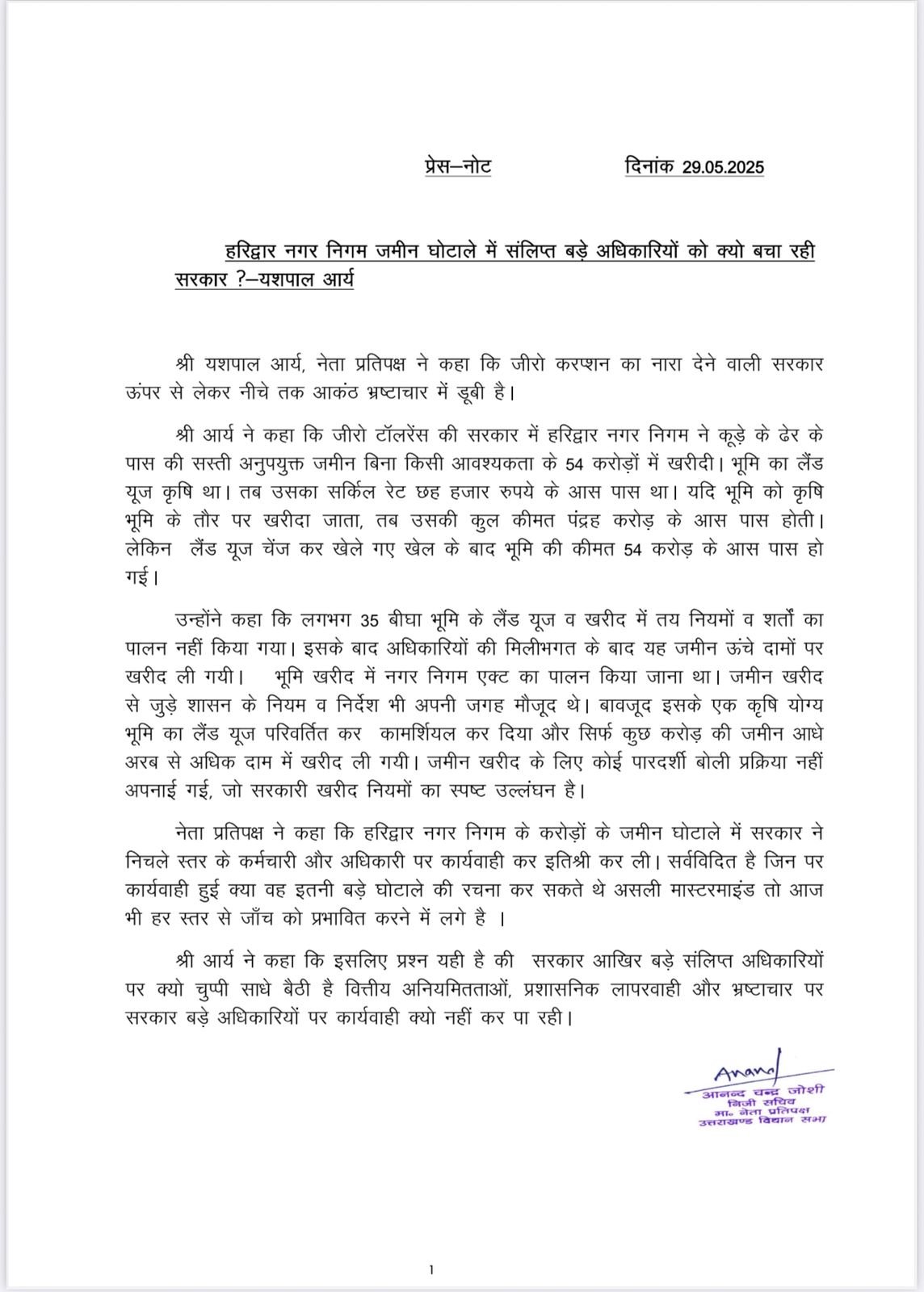 नेता प्रतिपक्ष ने कहा कि हरिद्वार नगर निगम के करोड़ों के जमीन घोटाले में सरकार ने निचले स्तर के कर्मचारी और अधिकारी पर कार्यवाही कर इतिश्री कर ली। सर्वविदित है जिन पर कार्यवाही हुई क्या वह इतनी बड़े घोटाले की रचना कर सकते थे असली मास्टरमाइंड तो आज भी हर स्तर से जाँच को प्रभावित करने में लगे है । यशपाल आर्य ने कहा कि इसलिए प्रश्न यही है की सरकार आखिर बड़े संलिप्त अधिकारियों पर क्यो चुप्पी साधे बैठी है वित्तीय अनियमितताओं, प्रशासनिक लापरवाही और भ्रष्टाचार पर सरकार बड़े अधिकारियों पर कार्यवाही क्यो नहीं कर पा रही।