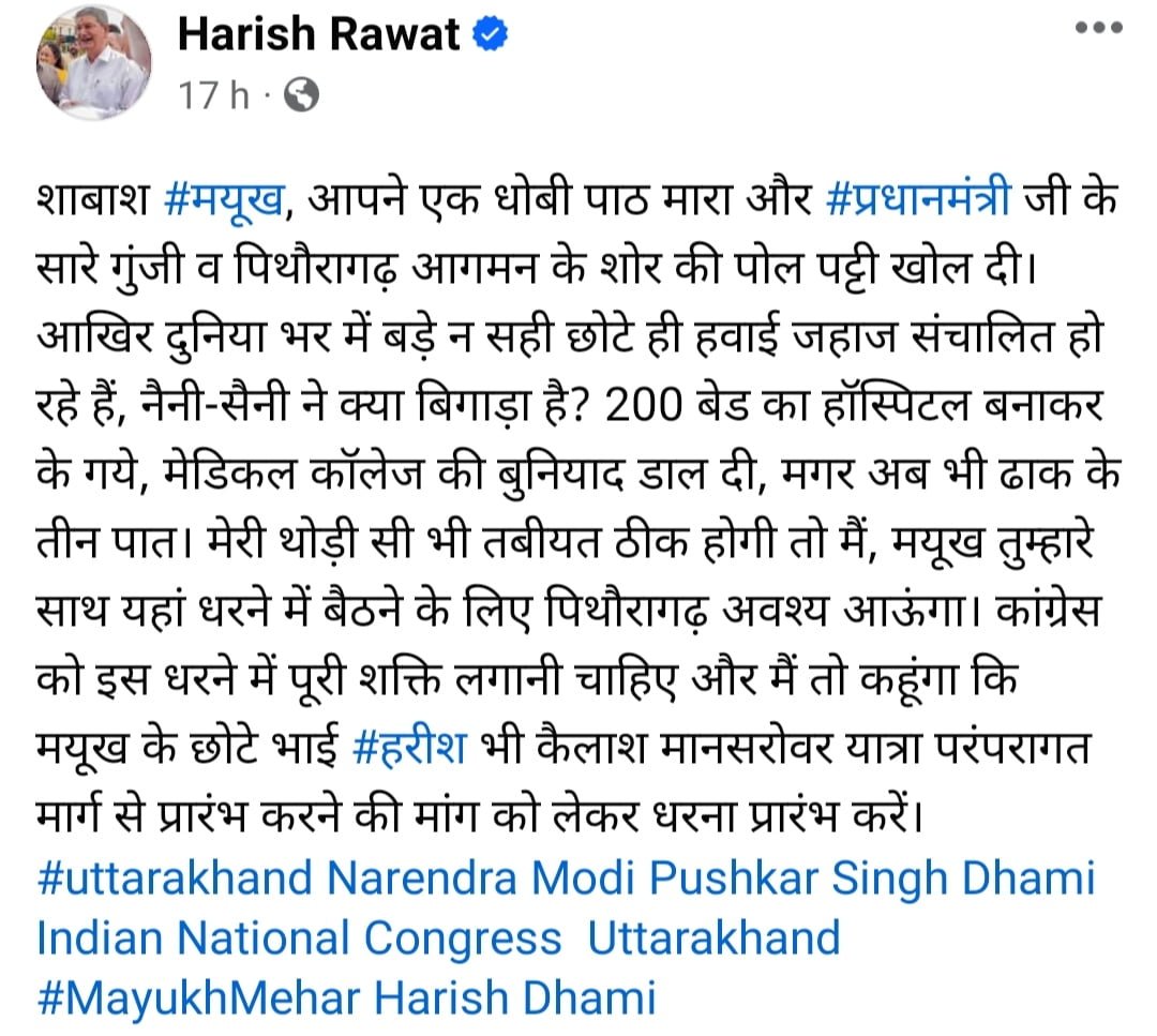 मेरी थोड़ी सी भी तबीयत ठीक होगी तो मैं, मयूख तुम्हारे साथ यहां धरने में बैठने के लिए पिथौरागढ़ अवश्य आऊंगा। कांग्रेस को इस धरने में पूरी शक्ति लगानी चाहिए और मैं तो कहूंगा कि मयूख के छोटे भाई #हरीश भी कैलाश मानसरोवर यात्रा परंपरागत मार्ग से प्रारंभ करने की मांग को लेकर धरना प्रारंभ करें।
