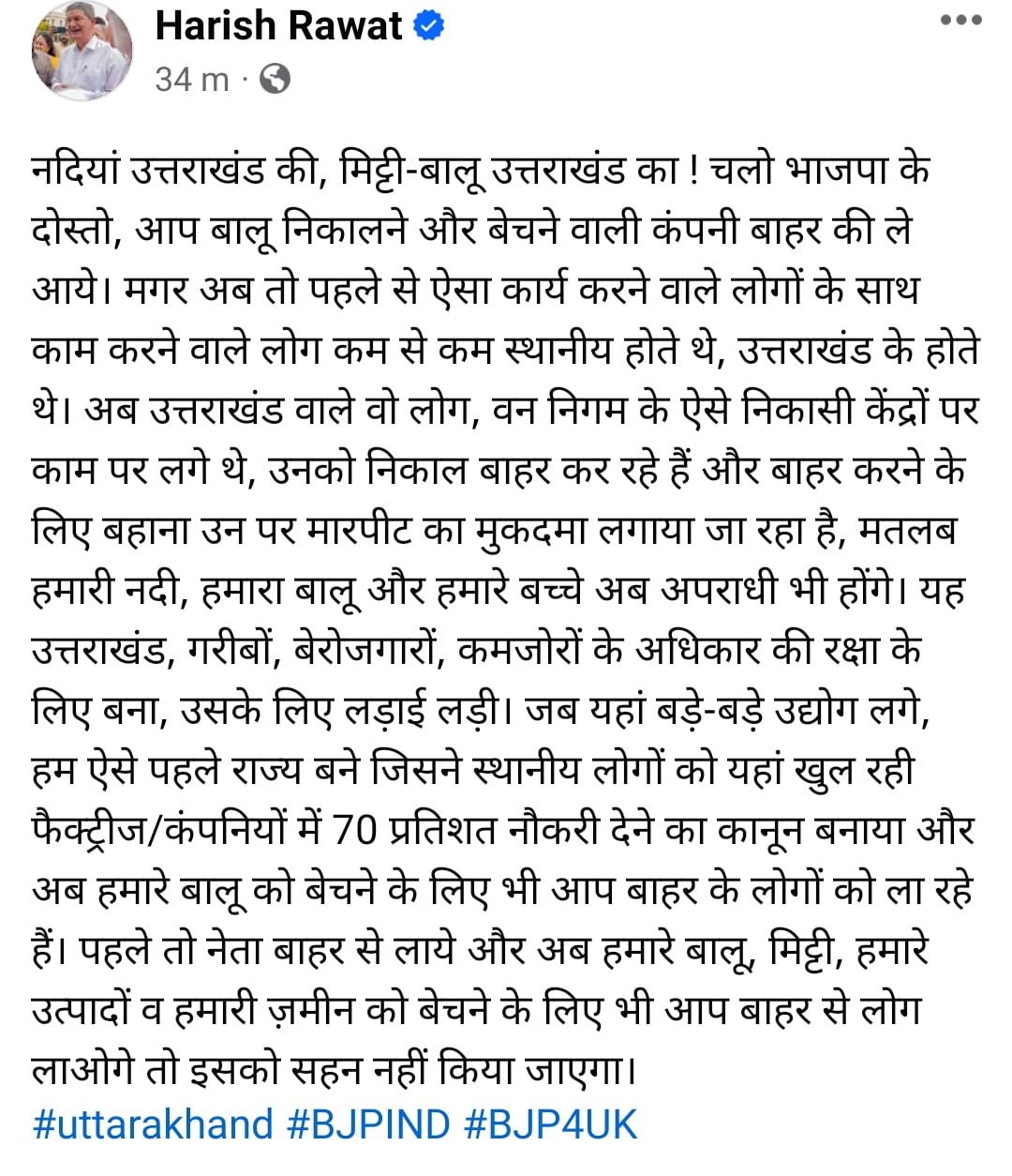हरीश रावत ने कहा है नदियां उत्तराखंड की, मिट्टी-बालू उत्तराखंड का ! चलो भाजपा के दोस्तो, आप बालू निकालने और बेचने वाली कंपनी बाहर की ले आये। मगर अब तो पहले से ऐसा कार्य करने वाले लोगों के साथ काम करने वाले लोग कम से कम स्थानीय होते थे, उत्तराखंड के होते थे। अब उत्तराखंड वाले वो लोग, वन निगम के ऐसे निकासी केंद्रों पर काम पर लगे थे, उनको निकाल बाहर कर रहे हैं और बाहर करने के लिए बहाना उन पर मारपीट का मुकदमा लगाया जा रहा है, मतलब हमारी नदी, हमारा बालू और हमारे बच्चे अब अपराधी भी होंगे।