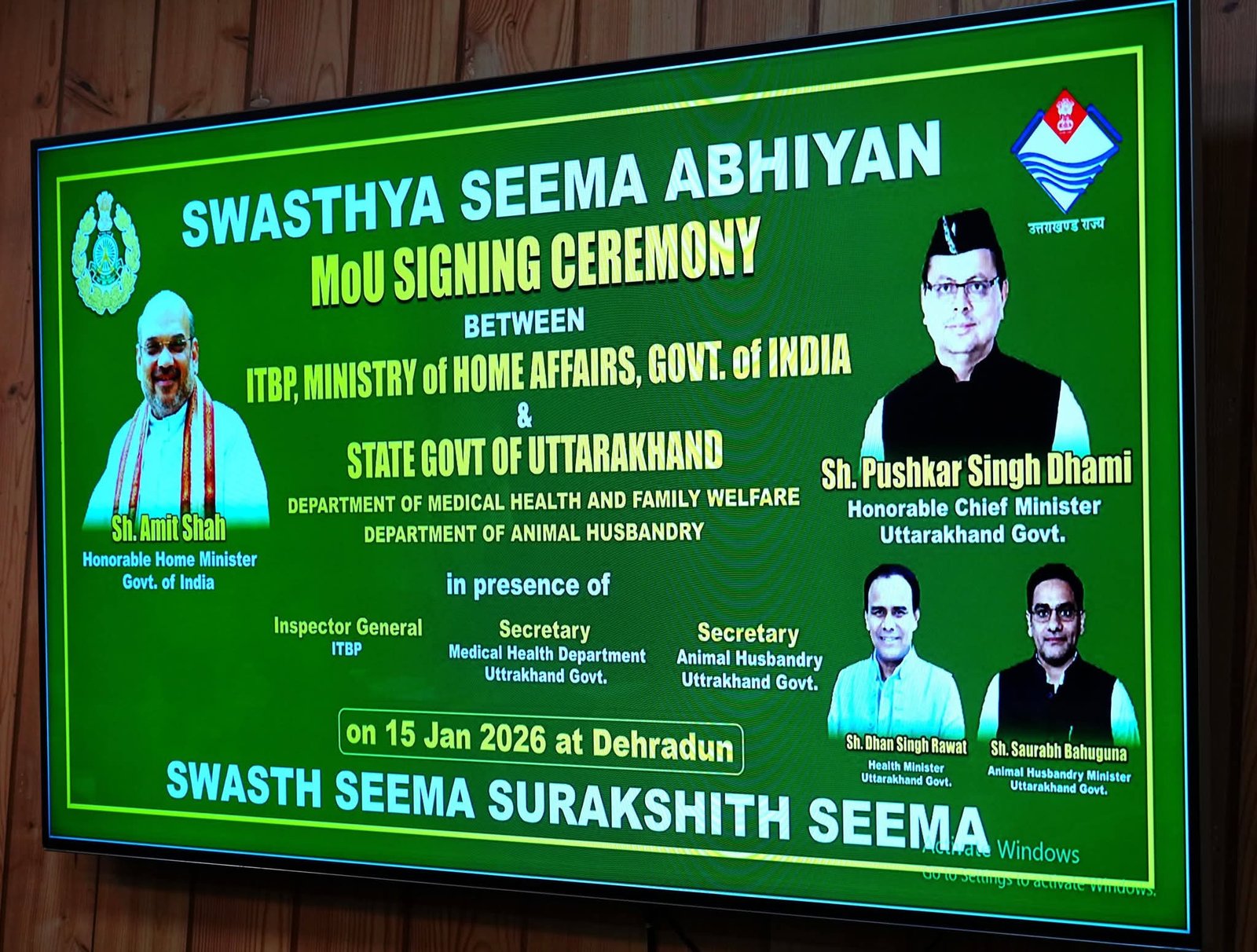 मुख्यमंत्री पुष्कर सिंह धामी की उपस्थिति में मुख्यमंत्री आवास में उत्तराखण्ड शासन एवं भारत–तिब्बत सीमा पुलिस (आईटीबीपी) के मध्य स्वस्थ सीमा अभियान के अंतर्गत एक महत्वपूर्ण समझौता ज्ञापन (MoU) पर हस्ताक्षर किए गए। इस अवसर पर स्वास्थ्य मंत्री डॉ. धन सिंह रावत एवं कैबिनेट मंत्री सौरभ बहुगुणा भी उपस्थित रहे।