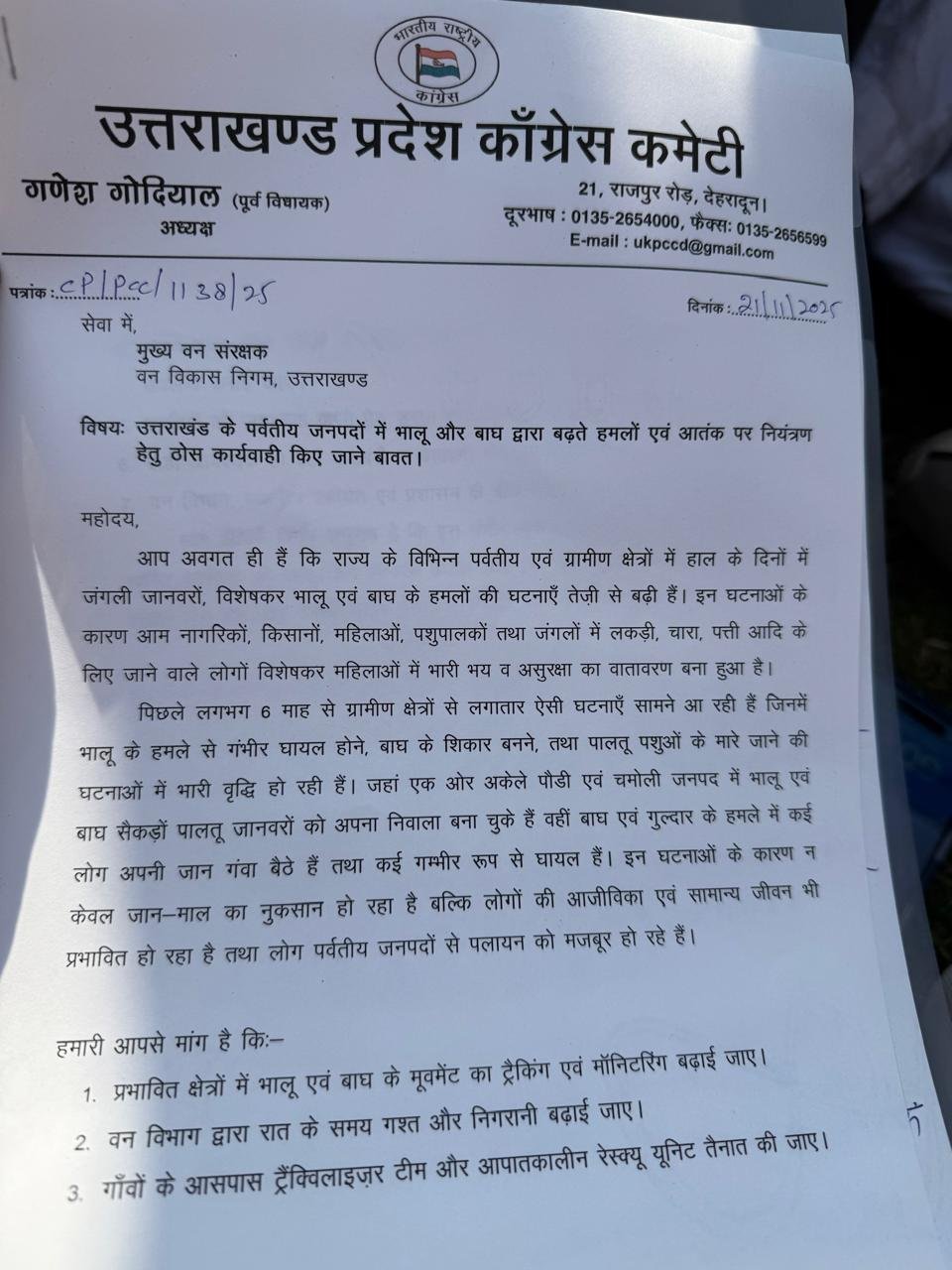 पूर्व निर्धारित कार्यक्रम के तहत प्रदेश अध्यक्ष गणेश गोदियाल के नेतृत्व में कांग्रेसजन बडी संख्या में दिलाराम चौक पर एकत्रित हुए जहां से उन्होंने वन विकास निगम कार्यालय की ओर कूच किया तथा मुख्य वन संरक्षक कार्यालय का घेराव करते हुए ज्ञापन के माध्यम से भालू एवं बाघ के हमले से हो रहे नुकसान को रोकने की जबरदस्त मांग की। मुख्य वन संरक्षक को सौंपे ज्ञापन में गणेश गोदियाल ने कहा कि राज्य के विभिन्न पर्वतीय एवं ग्रामीण क्षेत्रों में हाल के दिनों में जंगली जानवरों, विशेषकर भालू एवं बाघ के हमलों की घटनाएँ तेज़ी से बढ़ी हैं।