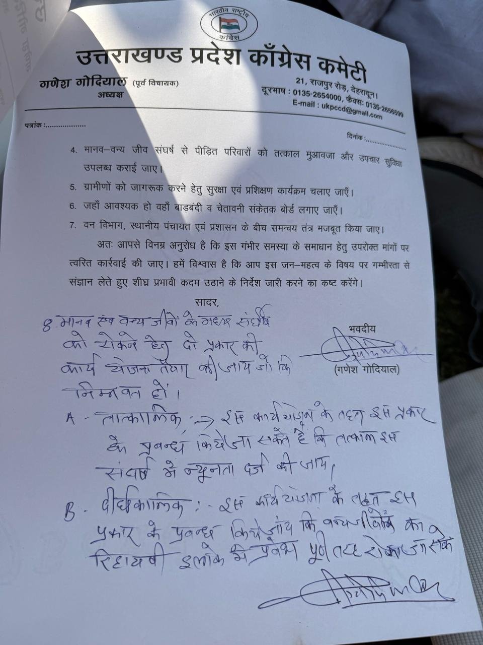 8. मानव एवं वन्य जीवों के मध्य संघर्ष को रोकने के लिए दो प्रकार की कार्य योजना तैयार की जाय। पहली तात्कालिक योजना जिसके तहत इस प्रकार के प्रबन्ध किये जांय कि तत्काल इस संघर्ष में न्यूनता दर्ज की जाय, दूसरी दीर्घ कालिक जिसके तहत इस प्रकार के प्रबन्ध किये जांय कि वन्य जीवों का रिहायशी इलाके में प्रवेश पूरी तरह से रोका जा सके। प्रदेश कांग्रेस अध्यक्ष गणेश गोदियाल ने कहा कि इस गंभीर समस्या के समाधान हेतु उपरोक्त मांगों पर त्वरित कार्रवाई की जाए। उन्होंने विश्वास व्यक्त किया कि वन विभाग इस जन-महत्व के विषय पर गम्भीरता से संज्ञान लेते हुए शीघ्र प्रभावी कदम उठायेगा।
