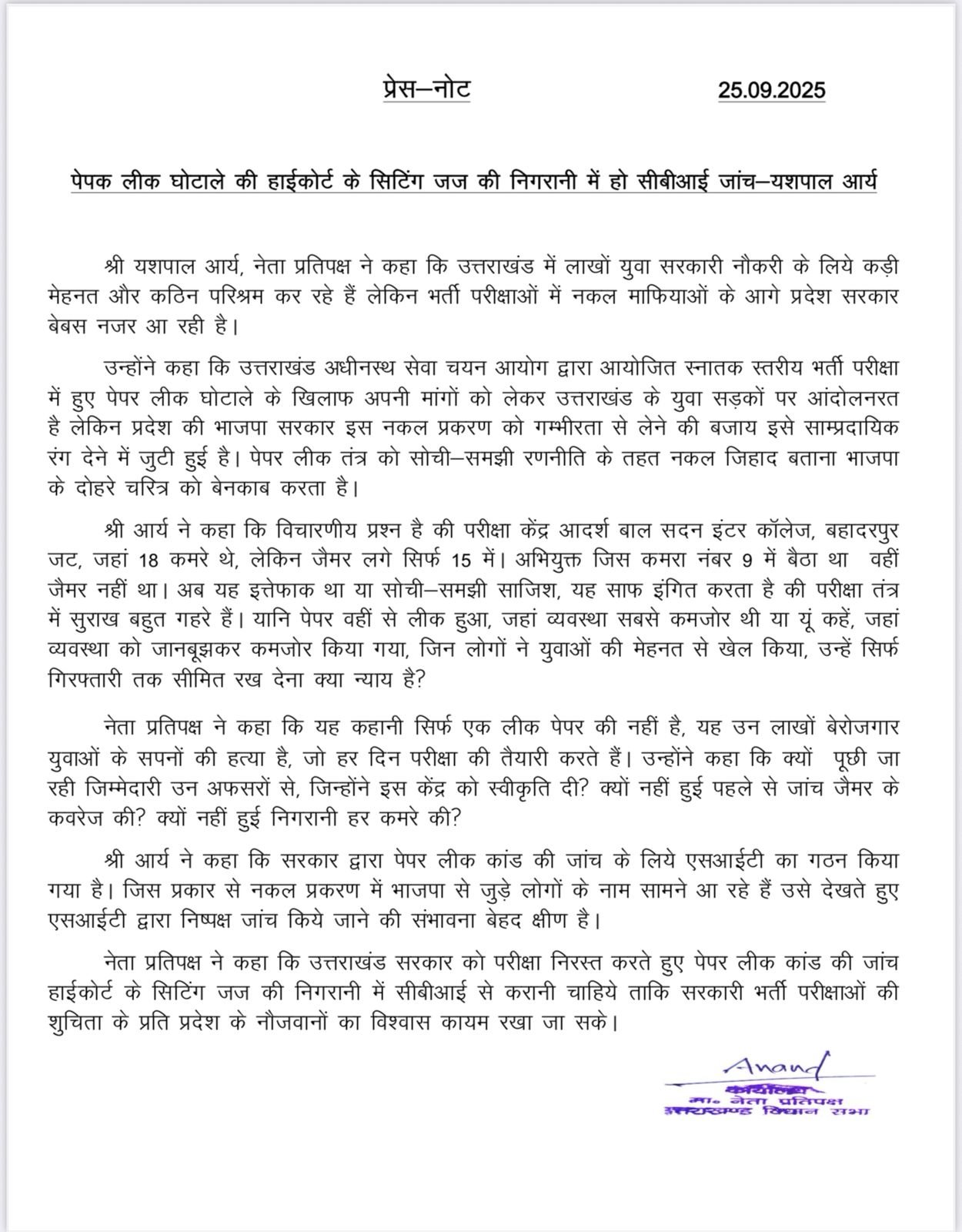 यशपाल आर्य ने कहा कि विचारणीय प्रश्न है की परीक्षा केंद्र आदर्श बाल सदन इंटर कॉलेज, बहादरपुर जट, जहां 18 कमरे थे, लेकिन जैमर लगे सिर्फ 15 में। अभियुक्त जिस कमरा नंबर 9 में बैठा था वहीं जैमर नहीं था। अब यह इत्तेफाक था या सोची-समझी साजिश, यह साफ इंगित करता है की परीक्षा तंत्र में सुराख बहुत गहरे हैं। यानि पेपर वहीं से लीक हुआ, जहां व्यवस्था सबसे कमजोर थी या यूं कहें, जहां व्यवस्था को जानबूझकर कमजोर किया गया, जिन लोगों ने युवाओं की मेहनत से खेल किया, उन्हें सिर्फ गिरफ्तारी तक सीमित रख देना क्या न्याय है?