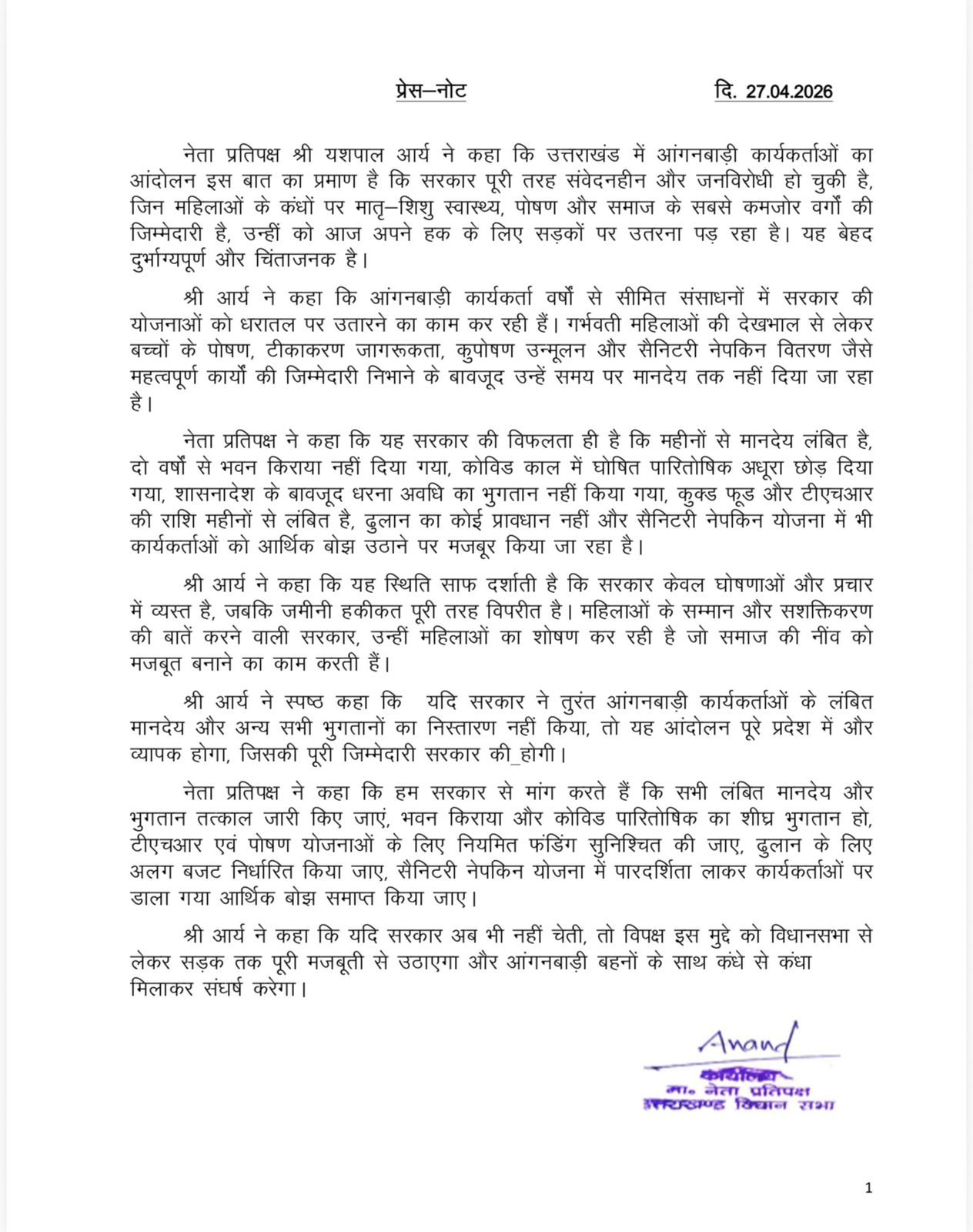 आर्य ने कहा कि अगर सरकार अब भी नहीं चेती, तो विपक्ष इस मुद्दे को विधानसभा से लेकर सड़क तक पूरी मजबूती से उठाएगा और आंगनबाड़ी बहनों के साथ कंधे से कंधा मिलाकर संघर्ष करेगा।