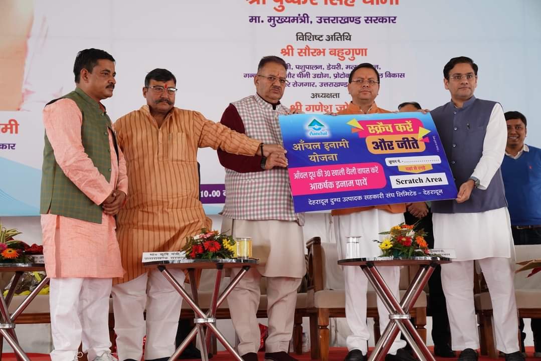 मुख्यमंत्री पुष्कर सिंह धामी ने आज सर्वे ऑफ इण्डिया स्टेडियम, हाथीबड़कला, देहरादून में आयोजित कार्यक्रम में प्रतिभाग करते हुए राज्य पशुधन मिशन योजनान्तर्गत लाभार्थियों को चेक वितरण किए। उन्होंने आंचल ब्राण्ड के तहत आंचल शहद एवं आंचल इनामी योजना का भी शुभारम्भ किया। मुख्यमंत्री ने इस अवसर पर भराड़ीसैंण में बद्री गाय ट्रेनिंग सेण्टर खोले जाने एवं दुग्ध उत्पादको हेतु दुग्ध दरों में एक रूपये प्रति लीटर की बढ़ोत्तरी करने की घोषणा की। मुख्यमंत्री ने कहा कि राज्य सरकार ने अगले दो वर्ष में पशुपालन की लगभग 4500 इकाईयों की स्थापना हेतु ऋण उपलब्ध कराने का लक्ष्य निर्धारित किया है। ये योजना सुदूर पर्वतीय क्षेत्रों में पारिवारिक पोषण और आजीविका को सुरक्षित बनाने एवं पलायन को रोकने में भी मील का पत्थर साबित हुई है। मुख्यमंत्री ने कहा कि राज्य में पहली बार गोट वैली योजना संचालित की जा रही है जिसके जरिए लगभग 1500 लाभार्थियों को एन०सी०डी०सी० के ऋण सहित लगभग 17 हजार से अधिक बकरियाँ वितरित की गई हैं। पोल्ट्री वैली तथा ब्रायलर फार्म की स्थापना करते हुए राज्य के कुक्कुट पालकों को कुक्कुट पालन व्यवसाय हेतु प्रोत्साहित किया जा रहा है। जिसके तहत 10 जिलों में 4000 कुक्कुट पालकों को लाभान्वित किया जा चुका है।