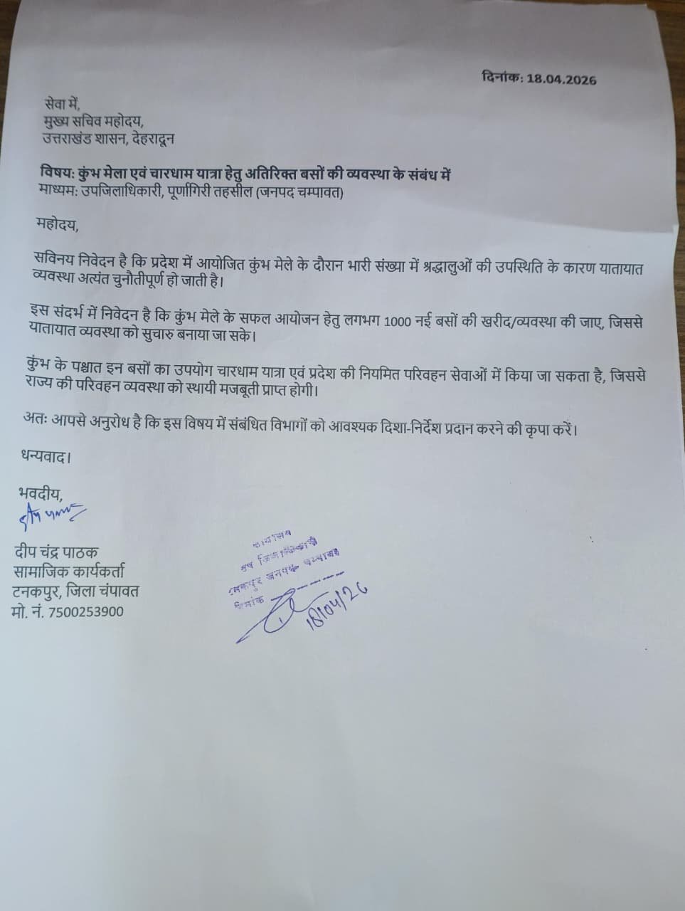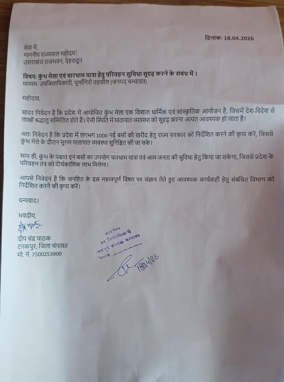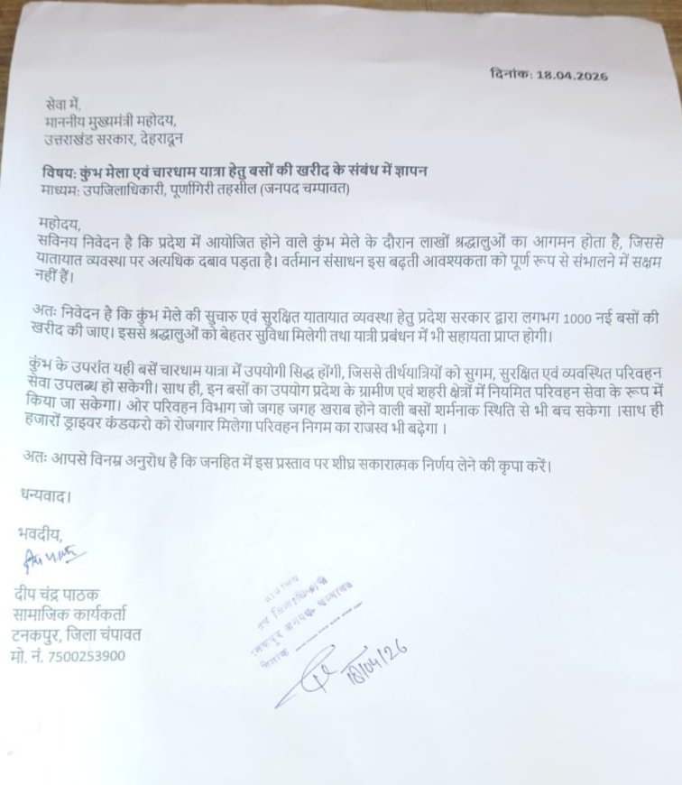 समाजसेवी दीप चंद्र पाठक ने प्रदेश में आयोजित होने वाले कुंभ मेला एवं चारधाम यात्रा के दृष्टिगत परिवहन व्यवस्था को सुदृढ़ करने की मांग को लेकर ज्ञापन प्रेषित किया। ये ज्ञापन मुख्यमंत्री, राज्यपाल और मुख्य सचिव, उत्तराखंड शासन को उपजिलाधिकारी, पूर्णागिरी तहसील (जनपद चंपावत) के माध्यम से भेजा गया।