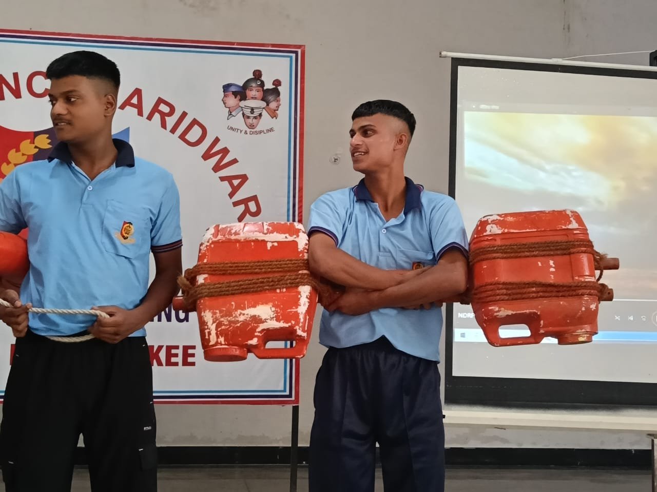 उन्होंने आकस्मिक स्थिति में स्थानीय संसाधनों जैसे प्लास्टिक की बोतलें, बांस, रस्सी आदि की मदद से तैरने वाले उपकरण (इम्प्रोवाइज्ड फ्लोटेशन डिवाइसेज़) बनाने का तरीका बताया, जिससे सीमित संसाधनों में भी लोगों की जान बचाई जा सकती है। NDRF टीम द्वारा इन उपकरणों का व्यावहारिक प्रदर्शन भी किया गया, जिससे कैडेट्स को रेस्क्यू तकनीकों को प्रत्यक्ष रूप से देखने और सीखने का अवसर मिला।