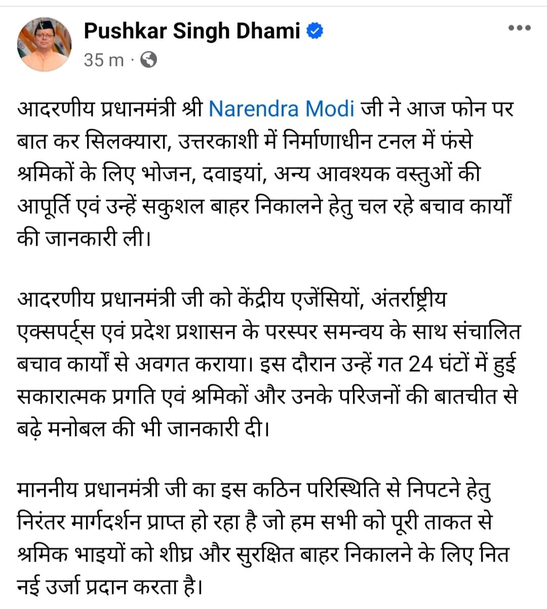 आदरणीय प्रधानमंत्री जी को केंद्रीय एजेंसियों, अंतर्राष्ट्रीय एक्सपर्ट्स एवं प्रदेश प्रशासन के परस्पर समन्वय के साथ संचालित बचाव कार्यों से अवगत कराया। इस दौरान उन्हें गत 24 घंटों में हुई सकारात्मक प्रगति एवं श्रमिकों और उनके परिजनों की बातचीत से बढ़े मनोबल की भी जानकारी दी।