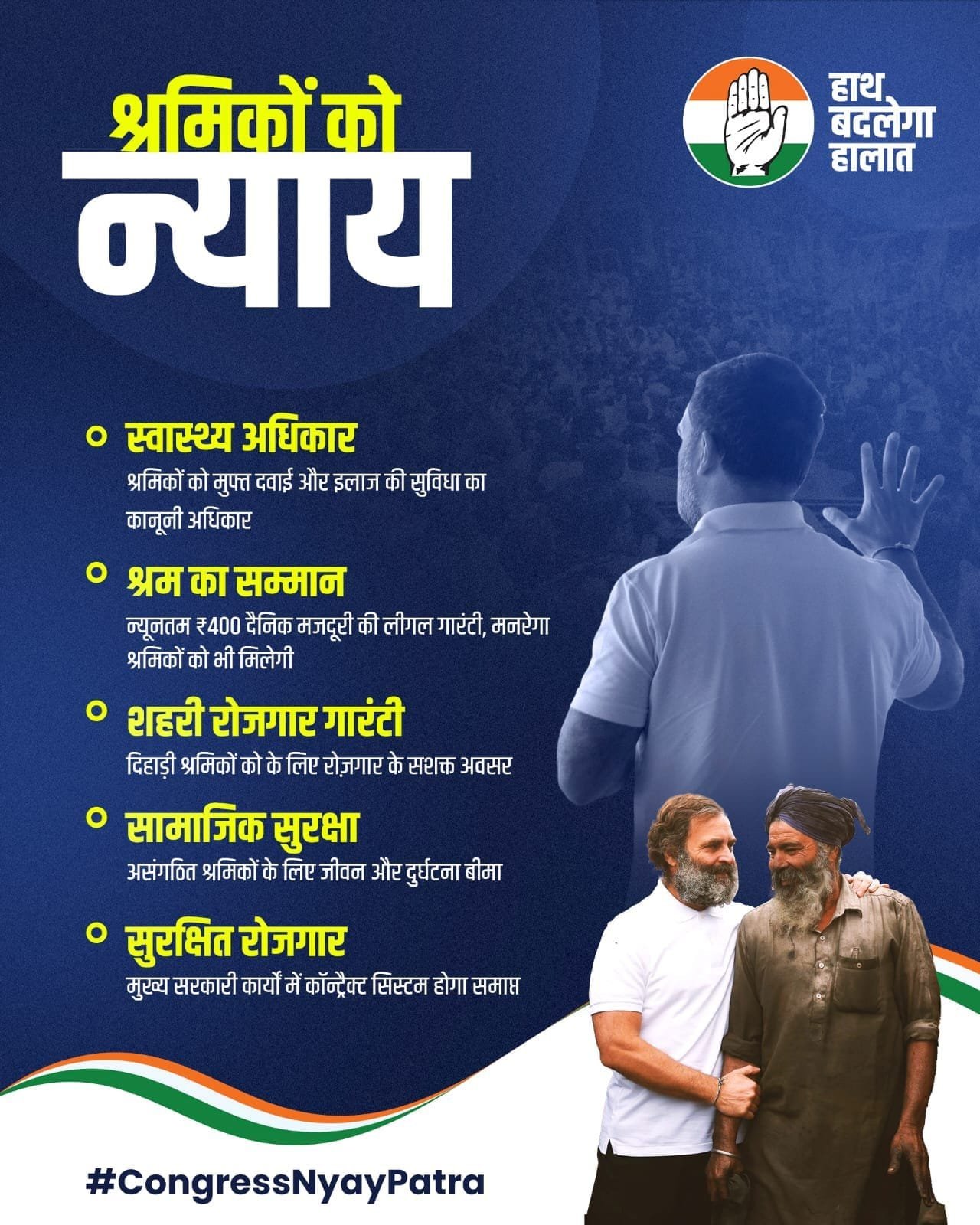 किसानों के हित के लिए एम.एस.पी. को कानूनी दर्जा देगी तथा किसानों की ऋण मॉफी के लिए एक स्थायी कोष का गठन करेगी। फसलों के नुकसान होने पर 30 दिनों के भीतर भुगतान तथा कृषि उपकरणों एवं अन्य सामान पर जीएसटी की समाप्ति करेगी। श्रमिक वर्ग को अधिकार के तौर पर मु्फ्त आवश्यक डायग्नोस्टिक, दवाएं, उपचार, सर्जरी और पुनर्वास उपचार तथा पैलिएटिव केयर सुविधा देगी। मनरेगा श्रमिकों को प्रति दिन 400 रूपये की मजदूरी तथा शहरी क्षेत्र के लिए रोजगार गारंटी अधिनियम। असंगठित क्षेत्र के श्रमिकों के लिए जीवन और दुर्घटना बीमा तथा मुख्य सरकारी कामों में ठेका प्रथा बंद करेगी। अनुसूचित जाति/जनजाति तथा पिछड़ा वर्ग को आरक्षण का निरंतर लाभ तथा जल-जंगल जमीन का कानूनी हक तथा वनाअधिकार अधिनियम के तहत लम्बित दावों का एक वर्ष के भीतर समाधान करेगी। क्योंकि कांग्रेस पार्टी समाज के अंतिम छोर पर बैठे व्यक्ति के लिए सोचती है भाजपा की तरह कुछ सरमायेदार उद्योगपति साथियों के लिए नहीं।