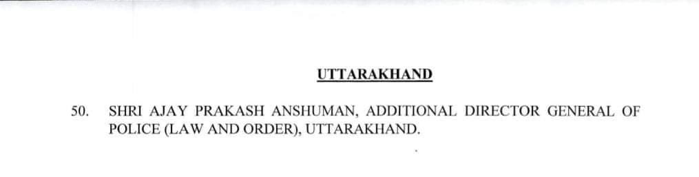 गणतंत्र दिवस के अवसर पर उत्तराखण्ड पुलिस के एडीजीपी कानून व्यवस्था श्री ए. पी. अंशुमान समेत छह पुलिस अधिकारियों और कर्मचारियों का राष्ट्रपति पुलिस पदक के लिए चयन किया गया है।