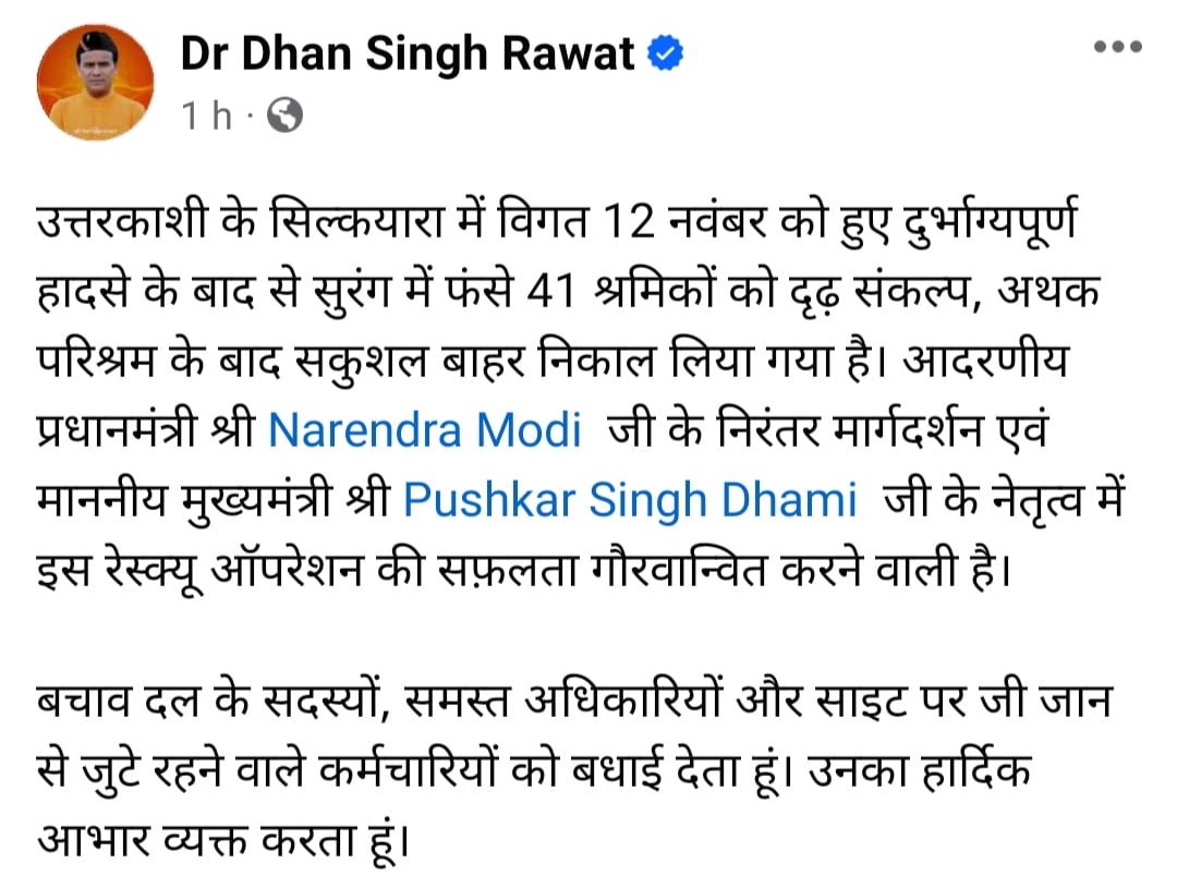 आदरणीय प्रधानमंत्री श्री Narendra Modi जी के मार्गदर्शन में त्वरित बचाव कार्य को किया गया। माननीय मुख्यमंत्री श्री Pushkar Singh Dhami जी, प्रधानमंत्री जी के पूर्व सलाहकार माननीय भास्कर खुल्बे जी एवं माननीय केंद्रीय मंत्री श्री General V.K. Singh जी पल-पल जमीनी स्तर पर मॉनिटरिंग कर रहे थे, आप सबको बधाई और आप सबका आभार।