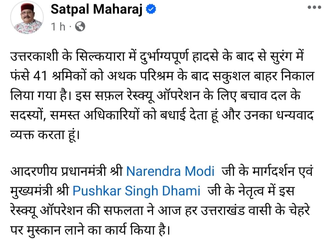 रेस्क्यू अभियान की सफलता को लेकर उत्तराखंड सरकार के मंत्री सतपाल महाराज, धन सिंह रावत ने भी पीएम मोदी के साथ साथ सीएम धामी की तारीफ की।