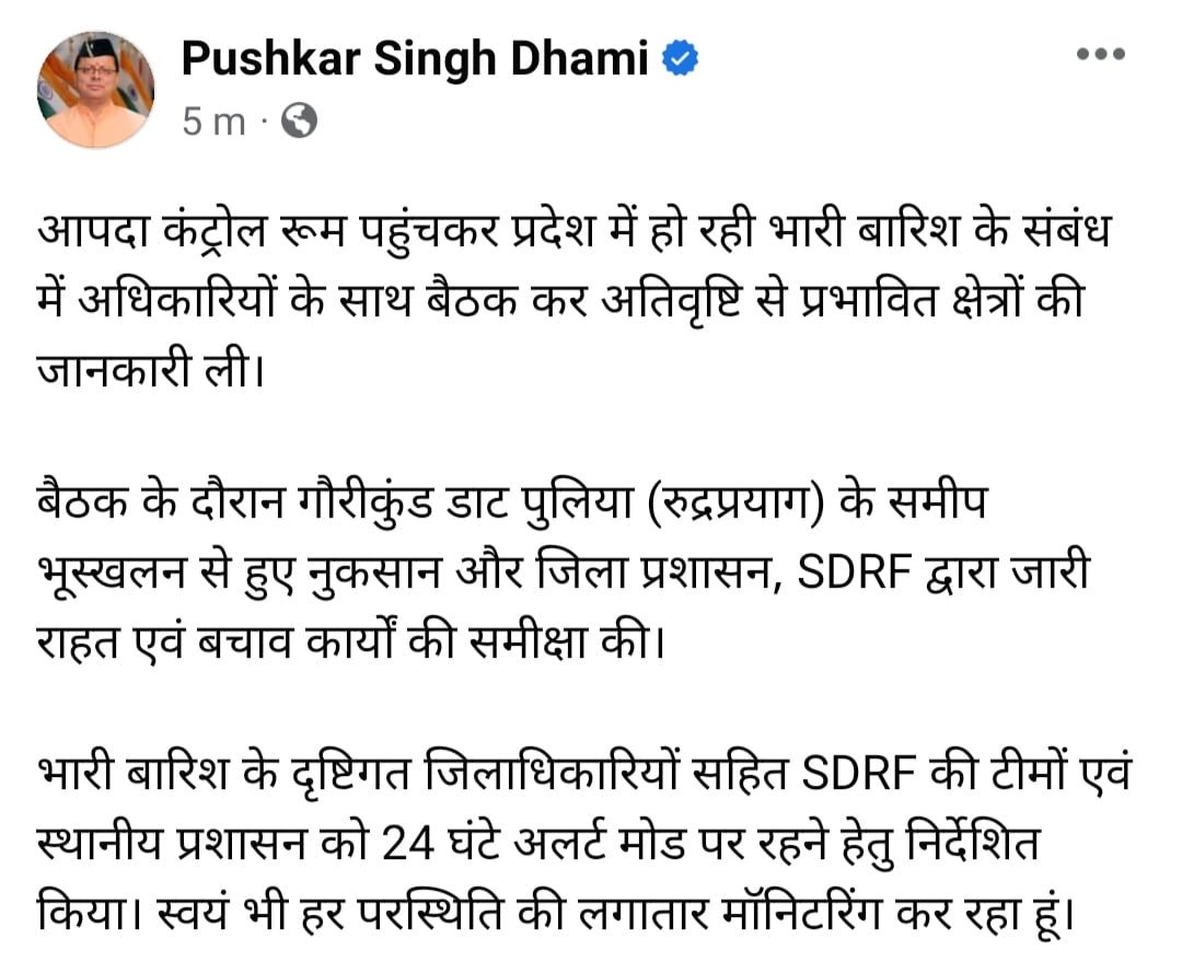 मुख्यमंत्री पुष्कर सिंह धामी ने देहरादून में आपदा कंट्रोल रूम पहुंचकर राज्य के अलग अलग हिस्सों में आई आपदा से जुड़ा अपडेट लिया। सीएम ने राहत बचाव काम की भी समीक्षा की। सीएम धामी ने अधिकारियों से बात की और निर्देश भी दिए। सीएम ने गौरीकुंड में हुए लैंडस्लाइड की भी जानकारी ली और वहां चलाए जा रहे रेस्क्यू का अपडेट लिया। सीएम ने राहत बचाव में तेजी लाने को कहा।