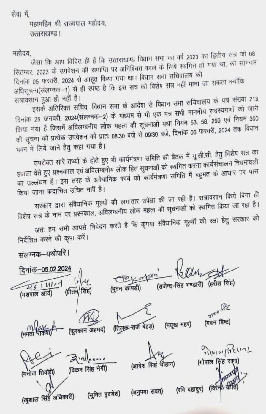 प्रतिनिधिमंडल में नेता प्रतिपक्ष यशपाल आर्य, उपनेता प्रतिपक्ष भुवन कापड़ी , विधायक राजेन्द्र भंडारी, हरीश धामी, ममता राकेश, फुरकान अहमद, तिलक राज़ बेहड़, मदन सिंह बिष्ट, मनोज तिवारी, विक्रम सिंह नेगी, आदेश सिंह चौहान, गोपाल सिंह राणा, खुशहाल सिंह अधिकारी और वीरेंद्र जाती जी मौजूद रहे।