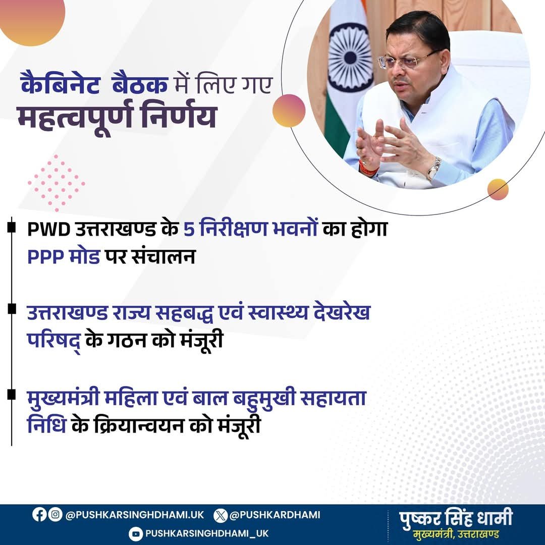 लोक निर्माण विभाग के 5 निरीक्षण भवनों (रानीखेत, उत्तरकाशी, दुग्गलबिट्टा, हर्षिल व ऋषिकेश) के पीपीपी मोड में संचालन द्वारा मुद्रीकरण का कार्य यूआईआईडीबी को सौंपा गया है। राष्ट्रीय सहबद्ध और स्वास्थ्य देखरेख वृत्ति आयोग अधिनियम 2021 के तहत उत्तराखण्ड राज्य सहबद्ध एवं स्वास्थ्य देखरेख परिषद के गठन को मंजूरी दी गई है।