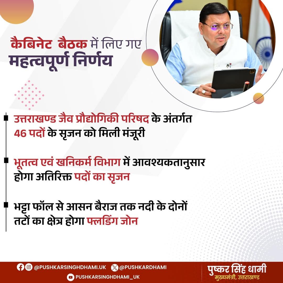 मुख्यमंत्री पुष्कर सिंह धामी की अध्यक्षता में हुई कैबिनेट बैठक में आज राज्यहित से जुड़े कई महत्वपूर्ण निर्णय लिये गये। उत्तराखण्ड जैव प्रौद्योगिकी परिषद की विभागीय संरचना में संशोधन को मंजूरी दी गई है। अब हल्द्वानी मुख्यालय और देहरादून केन्द्र के पदों को एकीकृत संवर्ग में रखा जाएगा।
