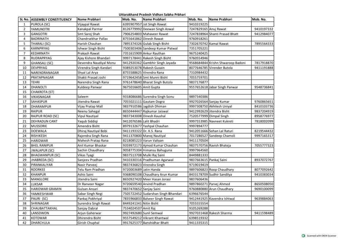 उपरोक्त जानकारी देते हुए प्रदेश कांग्रेस महामंत्री राजेन्द्र सिंह भण्डारी ने बताया कि प्रदेश कांग्रेस अध्यक्ष गणेश गोदियाल द्वारा प्रदेश में पार्टी संगठन द्वारा आयोजित कार्यक्रमों के सफल आयोजन एवं संगठनात्मक गतिविधियों के शुचारू संचालन के साथ-साथ आगामी विधानसभा चुनावों के दृष्टिगत विधानसभावार वरिष्ठ कांग्रेस नेताओं को प्रभार सौंपा है जिसके तहत विधानसभा क्षेत्र पुरोला में विजयपाल रावत एवं जोत सिंह रावत, यमुनोत्री में कनकपाल परमार, दीवान सिंह असवाल एवं अनुज रावत, गंगोत्री में शांति प्रसाद भट्ट, सरोज शाह एवं महावीर रावत, बद्रीनाथ में चन्द्रशेखर पल्लव एवं दिनेश रावत, थराली में हरीश चौहान, गुलाब सिंह बिष्ट एवं कमल रावत, कर्णप्रयाग में ईश्वर सिंह बिष्ट एवं संदीप कुमार पटवाल, केदारनाथ में प्रकाश रावत एवं अंकुर रौथाण, रुद्रप्रयाग में अजय किशोर भंडारी एवं राकेश सिंह बिष्ट, घनसाली में देवेन्द्र नौडियाल मोनू, गंभीर सिंह जयाडा एवं कृष्ण स्वरूप बडोनी, देवप्रयाग में विरेन्द्र सिंह कंडारी, राकेश गुसाईं एवं विरेन्द्र बुटोला, नरेंद्रनगर में श्याम लाल आर्य एवं विरेन्द्र राणा, प्रतापनगर में शक्ति प्रसाद जोशी एवं मुन्नी बिष्ट, टिहरी में नरेन्द्र सिंह राणा एवं भरत सिंह बुटोला, धनोल्टी में कुल्दीप पंवार, अमित गुप्ता एवं जबर सिंह पंवार, विकासनगर में सलीम एवं सुरेन्द्र सिह सोनू, सहसपुर जीतेन्द्र रावत, गौतम डोगरा एवं संजय कुमार, धर्मपुर में विजय प्रताप मल, जगदीश धीमान एवं अखिलेश उनियाल, रायपुर में नीनू सहगल, राजकुमार जयसवाल एवं जितेन्द्र बिष्ट, राजपुर रोड में विपुल नौटियाल, दिनेश कौशल एवं डिम्पल सिंह, देहरादून कैंट में याकूब सिद्धिकी, ललित भद्री एवं नवनीत कुकरेती, मसूरी में अमेन्द्र बिष्ट एवं यशपाल चौहान, डोईवाला में धीरज नौटियाल बॉबी, डॉ. के.एस. राणा एवं सोहन लाल रतूड़ी, ऋषिकेश राजेन्द्र सिंह राणा, मनोज नौटियाल एवं संदीप चमोली, हरिद्वार में महेश प्रताप राणा एवं वरुण वालियान, भेल रानीपुर में अनिल कुमार भास्कर, अजमोद कुमार चौहान एवं रवीश भटीजा, ज्वालापुर में सचिन चौधरी एवं हिमांशु बहुगुणा, भगवानपुर में विकास त्यागी एवं मुल्कीराज सैनी, झबरेड़ा में संजीव प्रधान, प्रधुम्न अग्रवाल एवं पंकज सोलंकी, पिरानकलियर में नासिर परवेज एवं वीरेंद्र सिंह, रूडकी में तेलु राम प्रधान, जतिन हांडा एवं रूप चौधरी, खानपुर में आशीष सैनी, चौधरी अरुण कुमार एवं सुधीर सांडिल्य, मैंगलोर में जितेन्द्र सैनी एवं मीर हसन जोरासी, लक्सर में डॉ. रणवीर नागर, अरविंद प्रधान एवं परवेज़ अहमद, हरिद्वार ग्रामीण में गुलसन अंसारी, संजय सैनी एवं अरुण चौधरी, यमकेश्वर में साबर सिंह नेगी एवं सुदर्शन सिंह भंडारी, पौडी में प