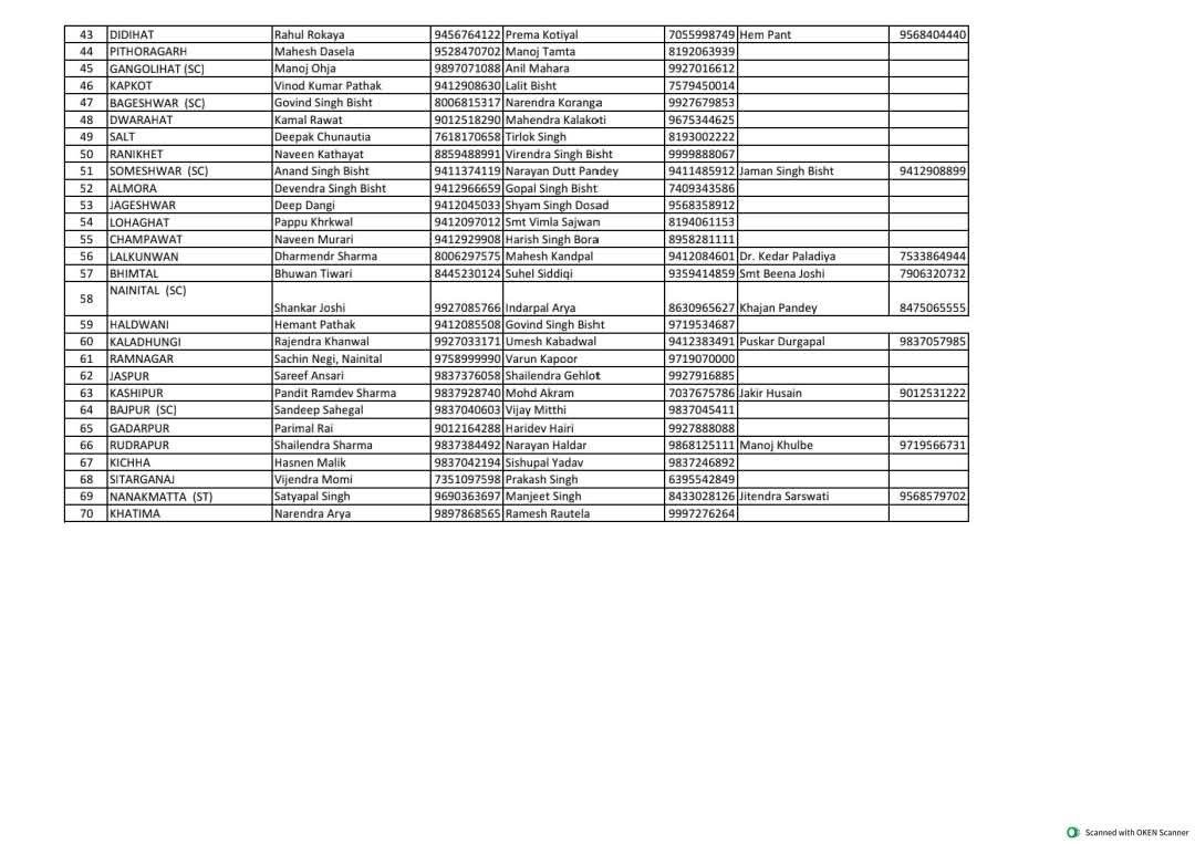 उत्तराखण्ड प्रदेश कांग्रेस कमेटी द्वारा अखिल भारतीय कांग्रेस कमेटी की संस्तुति पर प्रदेशभर में आयोजित होने वाले कार्यक्रमों के सफल आयोजन एवं संगठनात्मक गतिविधियों के सुचारू संचालन हेतु विधानसभा स्तर पर पार्टी के वरिष्ठ नेताओं को विधानसभावार प्रभारी की जिम्मेदारी सौंपी गई है।