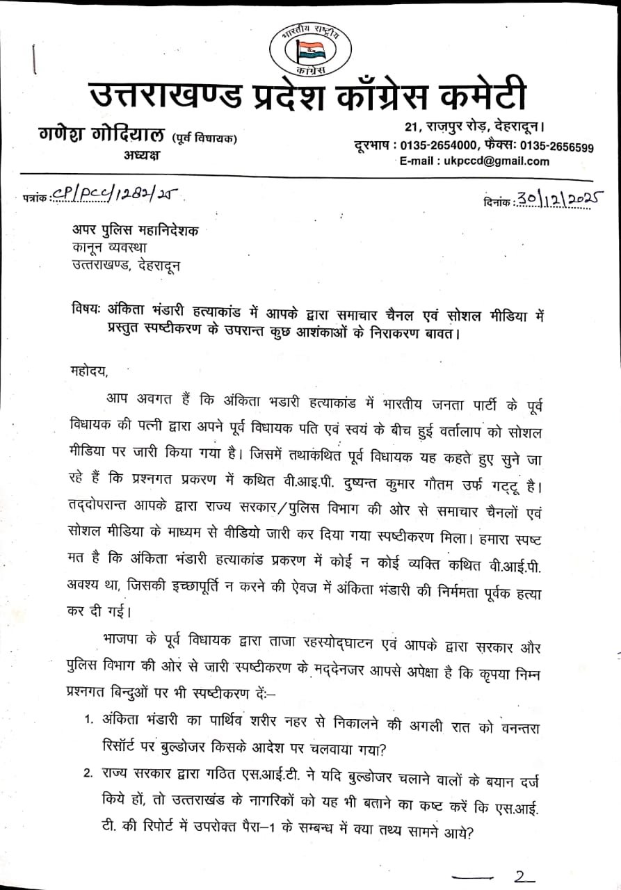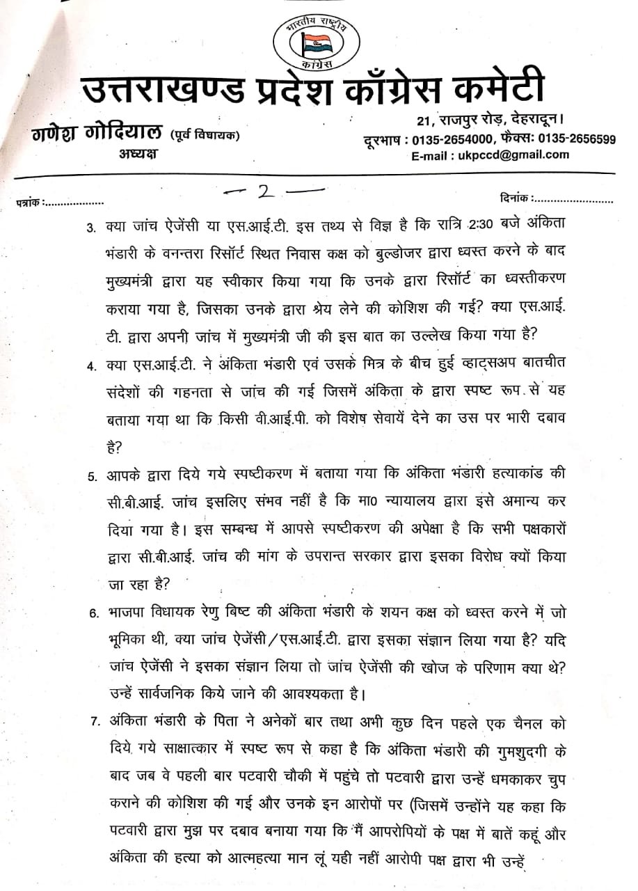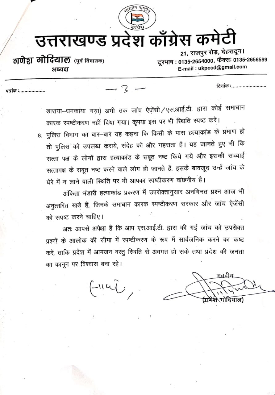 प्रदेश कांग्रेस अध्यक्ष गणेश गोदियाल ने कहा कि अंकिता भंडारी हत्याकांड प्रकरण में उपरोक्तानुसार अनगिनत प्रश्न आज भी अनुत्तरित खडे हैं, जिनके समाधान कारक स्पष्टीकरण सरकार और जांच ऐजेंसी को सपष्ट करने चाहिए। उन्होंने अपर पुलिस महानिदेशक कानून व्यवस्था से मांग की कि एस.आई.टी. द्वारा की गई जांच को उपरोक्त प्रश्नों के आलोक की सीमा में स्पष्टीकरण के रूप में सार्वजनिक करने का कष्ट करें, ताकि प्रदेश में आमजन वस्तु स्थिति से अवगत हो सके तथा प्रदेश की जनता का कानून पर विश्वास बना रहे।