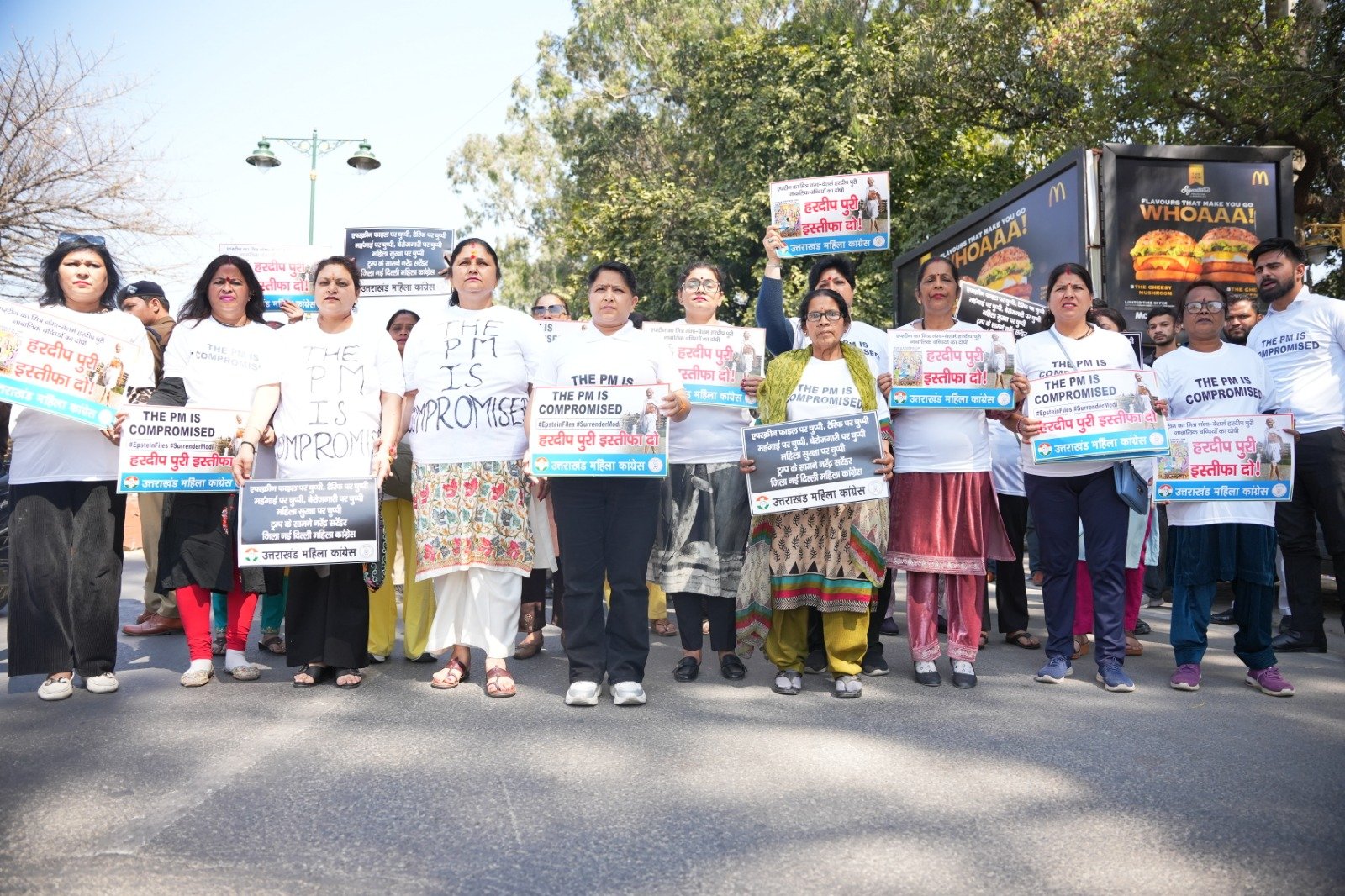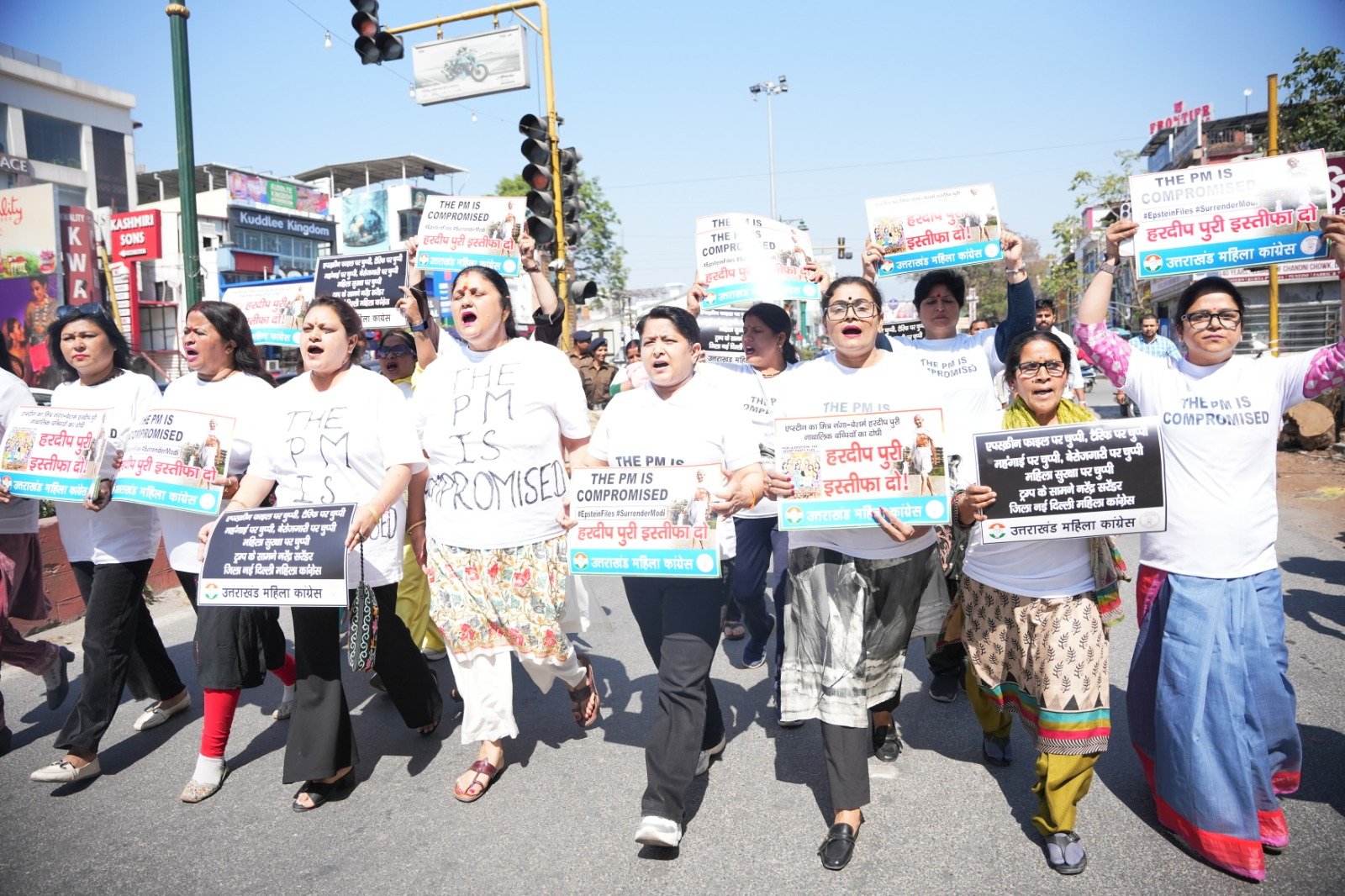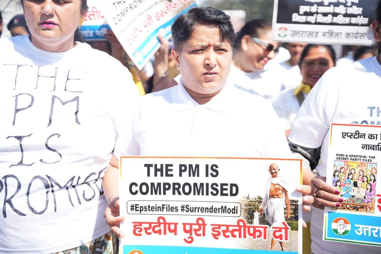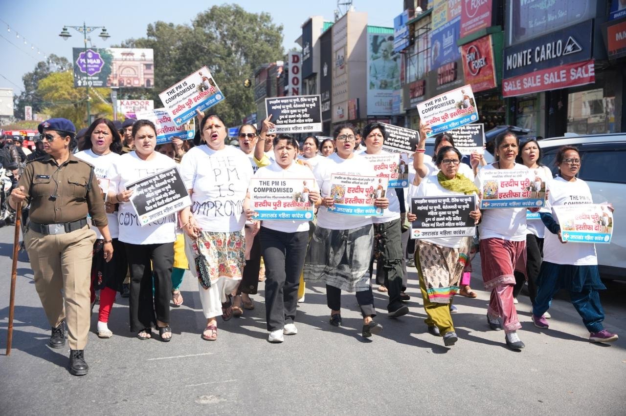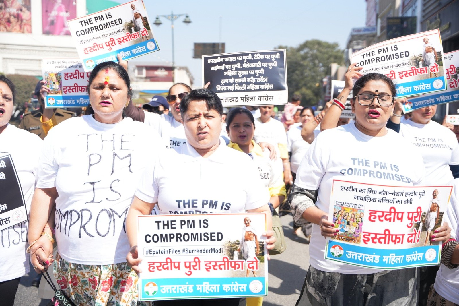 प्रधानमंत्री नरेन्द्र मोदी एवं केन्द्रीय मंत्री हरदीप पुरी का नाम एपस्टीन फाईल में उजागर होने पर हरदीप पुरी के इस्तीफे की मांग को लेकर आज प्रदेश महिला कांग्रेस अध्यक्ष ज्योत रौतेला के नेतृत्व में महिला कांग्रेस कार्यकर्ताओं ने प्रदेश कांग्रेस कार्यालय राजीव भवन से गांधीपार्क-घंटाघर-पल्टन बाजार होते हुए तहसील चौक एवं वापस प्रदेश कांग्रेस कार्यालय तक **THE PM IS Compromised** लिखी विषेश पोषाक पहनकर विरोध-प्रदर्शन के साथ मार्च निकाला तथा केन्द्रीय मंत्री हरदीप पुरी के इस्तीफे की मांग की।