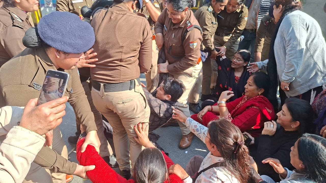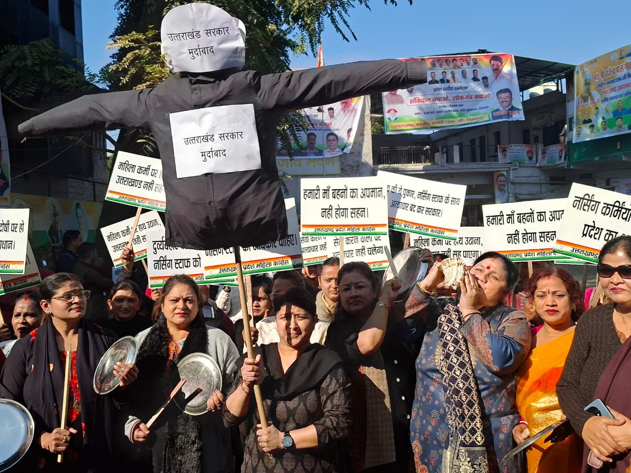 नर्सिंग बेरोज़गार युवतियों के शांतिपूर्ण प्रदर्शन के दौरान महिला पुलिसकर्मियों द्वारा की गई अभद्रता और थप्पड़ मारने की घटना के विरोध में आज उत्तराखंड महिला कांग्रेस ने प्रदेश अध्यक्ष ज्योति रौतेला के नेतृत्व में प्रदेश कांग्रेस मुख्यालय से चलकर पुलिस मुख्यालय पर जोरदार प्रदर्शन कर घेराव किया। इस विरोध कार्यक्रम में बड़ी संख्या में नर्सिंग बेरोजगार युवतियाँ भी उपस्थित रहीं। महिला कांग्रेस की नेत्रियों को पुलिस मुख्यालय से पहले ही बैरिकेडिंग लगाकर रोक दिया गया जहां उन्होंने बैरिकेडिंग पर चढ़कर उत्तराखंड सरकार का पुतला दहन किया। नरसिंह बेरोजगारों को और महिला कांग्रेस की नेत्रियों और कार्यकर्ताओं को पुलिस गाड़ियों में भरकर एकता विहार छोड़ आई।