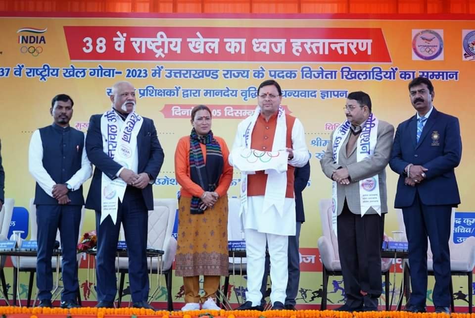 मुख्यमंत्री पुष्कर सिंह धामी आज महाराणा प्रताप स्पोर्टस कॉलेज, देहरादून में आयोजित होने वाले 38वें राष्ट्रीय खेल ध्वज हस्तांतरण एवं 37वें राष्ट्रीय खेल गोवा-2023 में उत्तराखण्ड के पदक विजेता खिलाडियों के सम्मान समारोह में प्रतिभाग किया। मुख्यमंत्री धामी ने उत्तराखण्ड राज्य को 38वें राष्ट्रीय खेलों के आयोजन तथा राष्ट्रीय खेल ध्वज मिलने पर प्रदेशवासियों को हार्दिक बधाई एवं शुभकामनाएं दी। उन्होंने कहा कि उत्तराखण्ड राज्य में आयोजित होने वाले 38वें राष्ट्रीय खेल अभूतपूर्व एवं गौरवशाली होगें और निश्चित रूप से यह खेल राज्य को खेल भूमि के रूप में पहचान दिलाने में मील का पत्थर साबित होंगे।