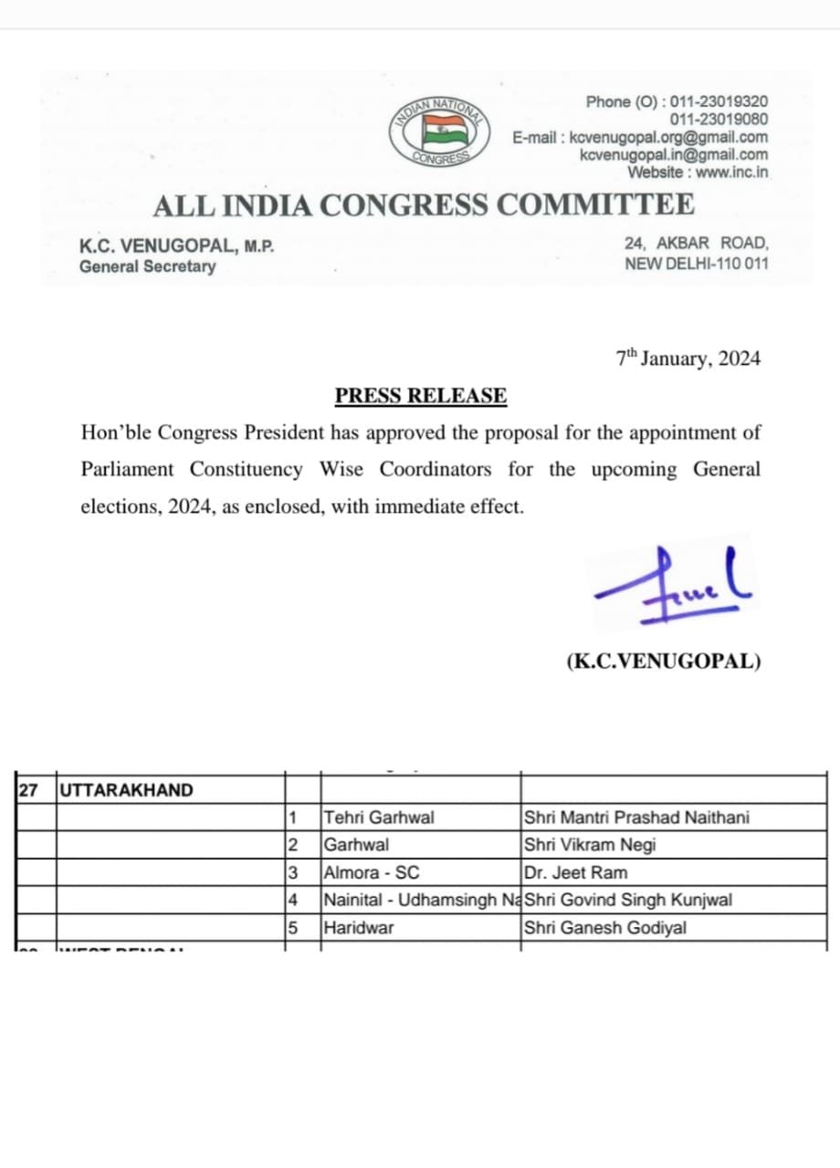 लोकसभा चुनाव के लिए कांग्रेस ने उत्तराखंड की पांच सीटों पर 5 कॉर्डिनेटर तय कर दिए हैं। टिहरी लोकसभा की जिम्मेदारी पूर्व मंत्री मंत्री प्रसाद नैथानी को सौंपी गई है। जबकि पौड़ी लोकसभा सीट के लिए विधायक विक्रम सिंह नेगी का नाम तय किया गया है।