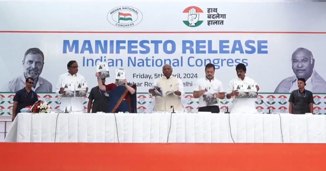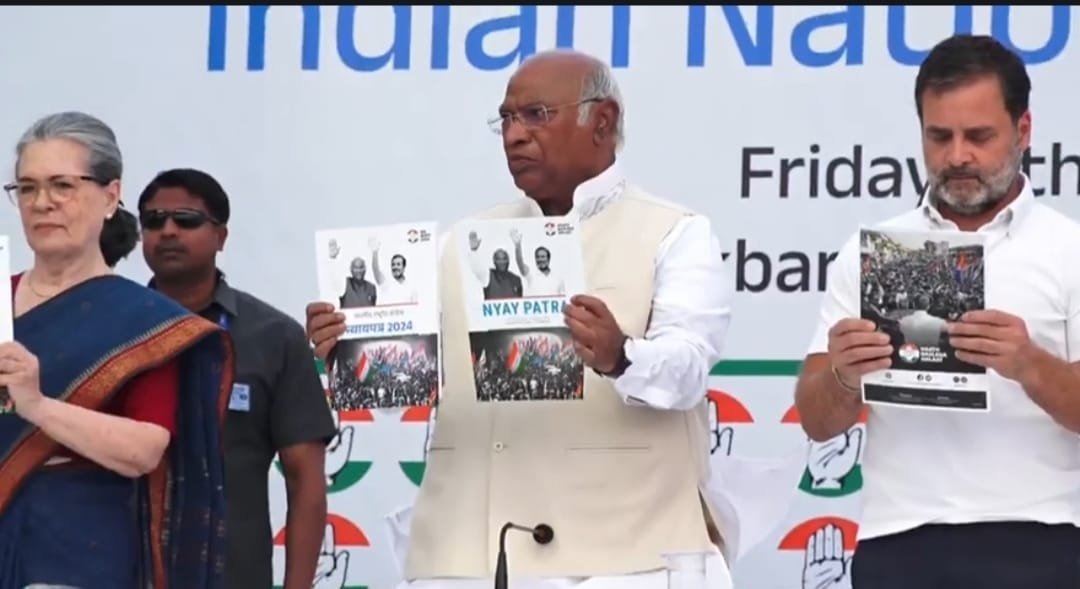 कांग्रेस ने लोकसभा चुनाव के लिए घोषणा पत्र जारी कर दिया है। दिल्ली में कांग्रेस मुख्यालय से मेनिफेस्टो जारी किया गया। कांग्रेस अध्यक्ष मल्लिकार्जुन खड़गे, सोनिया गांधी, राहुल गांधी की मौजूदगी में घोषणा पत्र रिलीज किया गया। इसमें 5 न्याय और 25 गारंटी का जिक्र है। कांग्रेस ने हर तबके को साधने की कोशिश की है। युवा न्याय, नारी न्याय, किसान न्याय, श्रमिक न्याय और हिस्सेदारी न्याय घोषणा पत्र के सबसे अहम प्वाइंट हैं। मल्लिकार्जुन खड़गे ने साफ किया है कि जो काम धरातल पर हो सकते हैं वही वादे घोषणा पत्र में किए गए हैं। युवाओं को रोजगार, गरीब महिलाओं को सालाना एक लाख रुपये, किसानों को फसलों की एस एस पी समेत कई और गारंटी भी इस घोषणा पत्र में हैं। कांग्रेस ने सेना में अग्निपथ योजना खत्म करने का ऐलान किया गया है। यानी तीनों सेनाओं में पहले की तरह ही रेगुलर भर्ती का वादा भी कांग्रेस ने किया है। कांग्रेस ने साफ किया कि सरकार बनने के बाद तुरंत घोषणा पत्र लागू किया जाएगा ताकि लोगों को फायदा मिल सके।