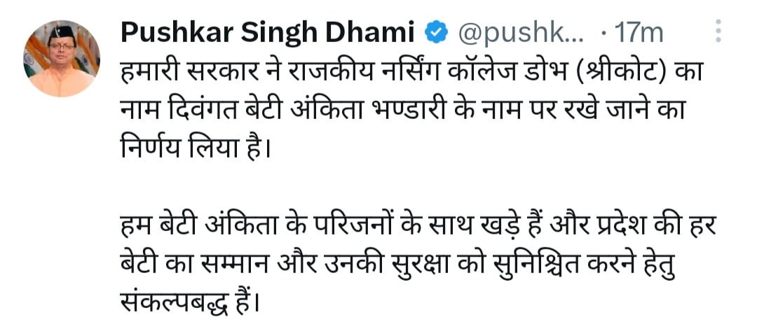 “हमारी सरकार ने राजकीय नर्सिंग कॉलेज डोभ (श्रीकोट) का नाम दिवंगत बेटी अंकिता भण्डारी के नाम पर रखे जाने का निर्णय लिया है।