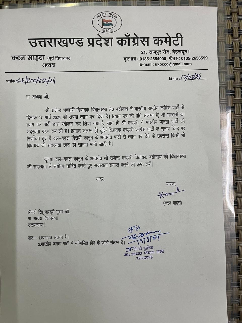 उत्तराखंड की बदरीनाथ सीट से विधायक राजेंद्र भंडारी की विधानसभा सदस्यता कभी भी जा सकती है। राजेंद्र भंडारी के बीजेपी में शामिल होते ही उत्तराखंड कांग्रेस अध्यक्ष करन माहरा ने विधानसभा अध्यक्ष ऋति खंडूरी को चिट्टी लिखकर राजेंद्र भंडारी की सदस्या रद्द करने की मांग की है। करन माहरा ने इसके लिए दल बदल कानून का हवाला दिया है।
